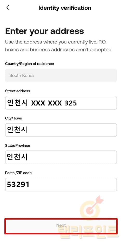 - 상세 주소지를 입력한 후 Next를 클릭합니다.