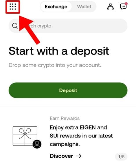 - OKX 거래소 홈화면에서 우측 상단 사각 버튼을 클릭합니다.