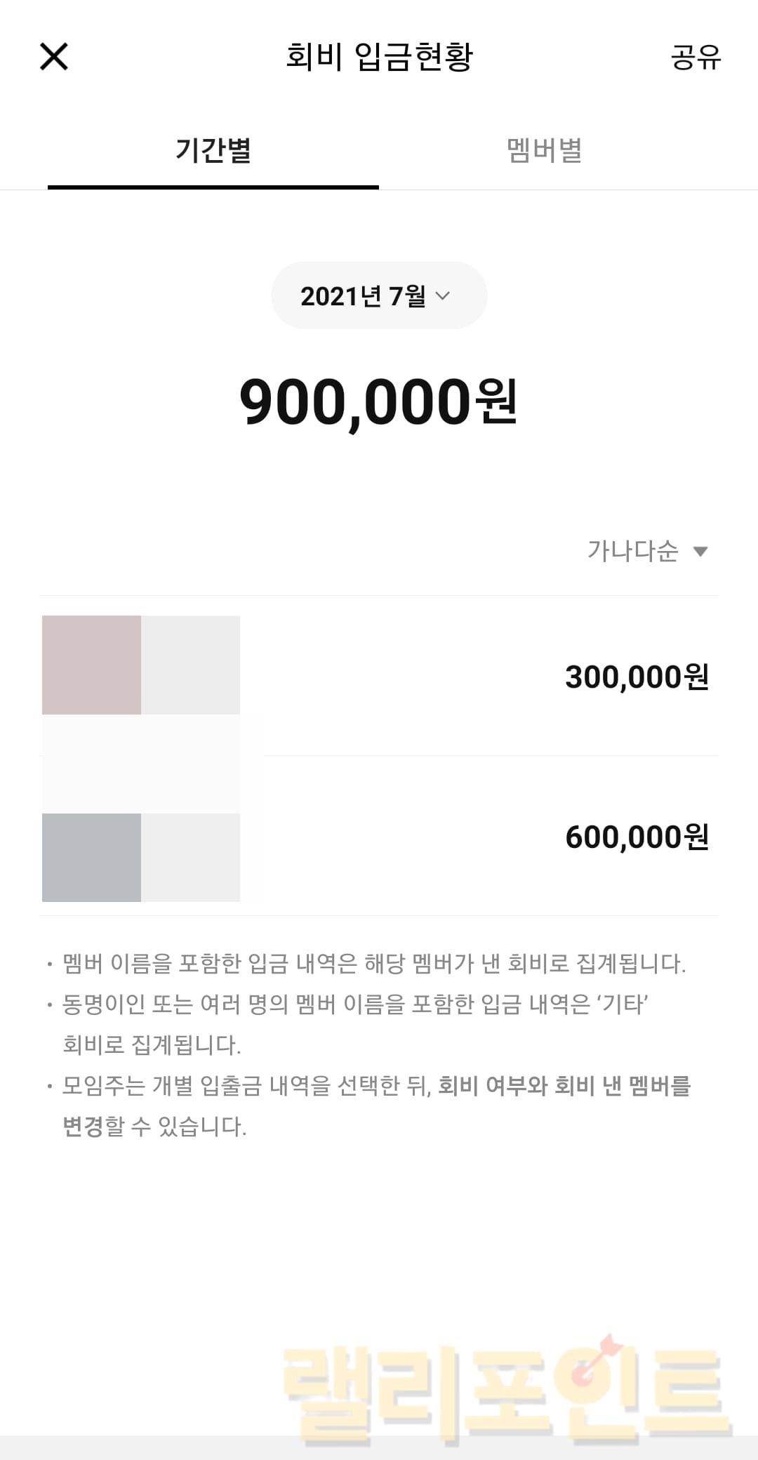 모임통장 클릭 > 회비 입금현황을 누르면 멤버별 월단위 입금 내역을 확인할 수 있습니다. 동명이인 또는 여러 명의 멤버 이름을 포함한 입금 내역은 기타 회비로 집계됩니다.