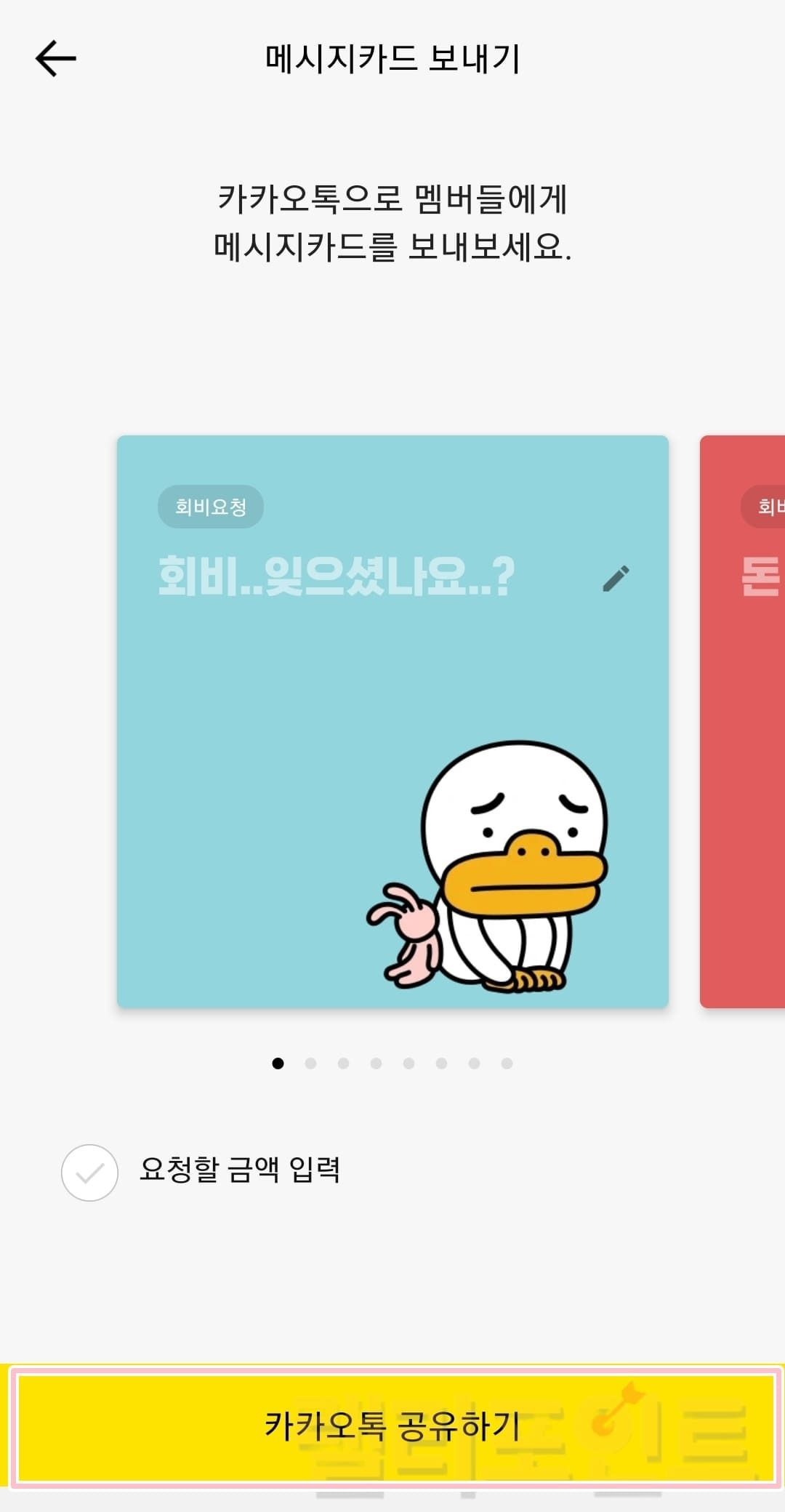 ① 모임장은 메시지카드 보내기 기능으로 회비를 입금하지 않은 회원들에게 회비요청 카톡 메시지를 보낼 수 있습니다. 요청 금액을 입력하고 발송하면 카톡 문자로 상대방에게 입금 메시지가 보내집니다.