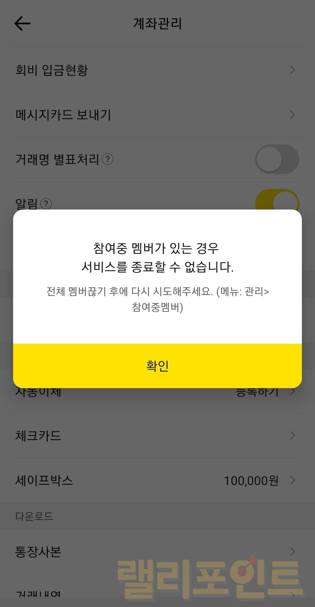 ③ 참여중 멤버가 있을 경우 모임통장은 모임장이더라도 서비스 종료가 불가능합니다. 따라서 전체 멤버끊기 후에 시도해야하며 이 때 관리 > 참여중멤버에서 관리할 수 있습니다.