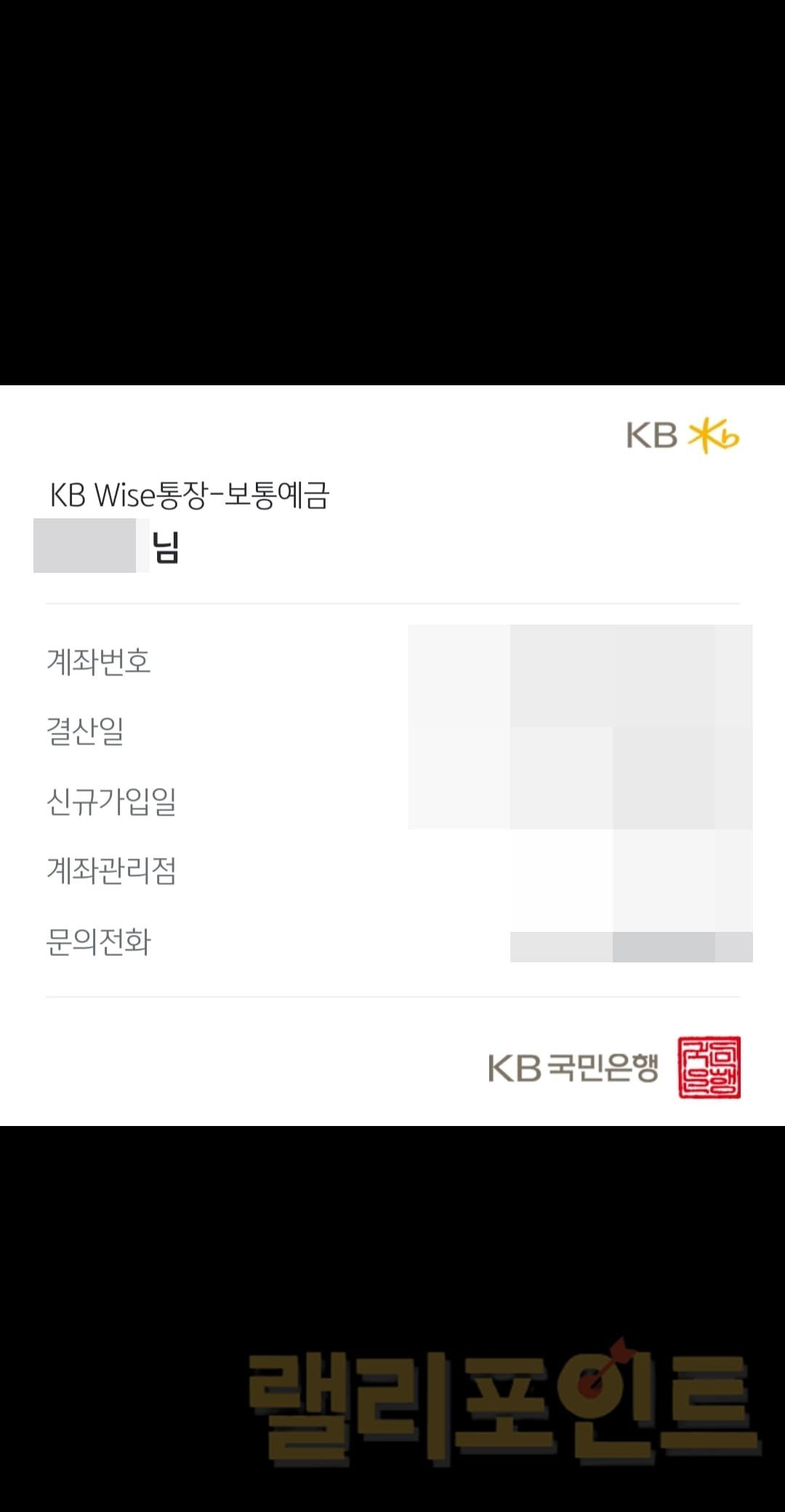 국민은행 통장사본 모바일 어플 발급시 계좌번호, 결산일, 신규가입일, 계좌관리점, 문의전화 정보를 확인할 수 있습니다. 우측 아래에는 KB국민은행 인장이 찍혀져있음으로 본인계좌 개설 확인용으로 사용하기 적합합니다. 참고로 이외에 어떠한 용도의 증명서로도 사용할 수 없습니다.