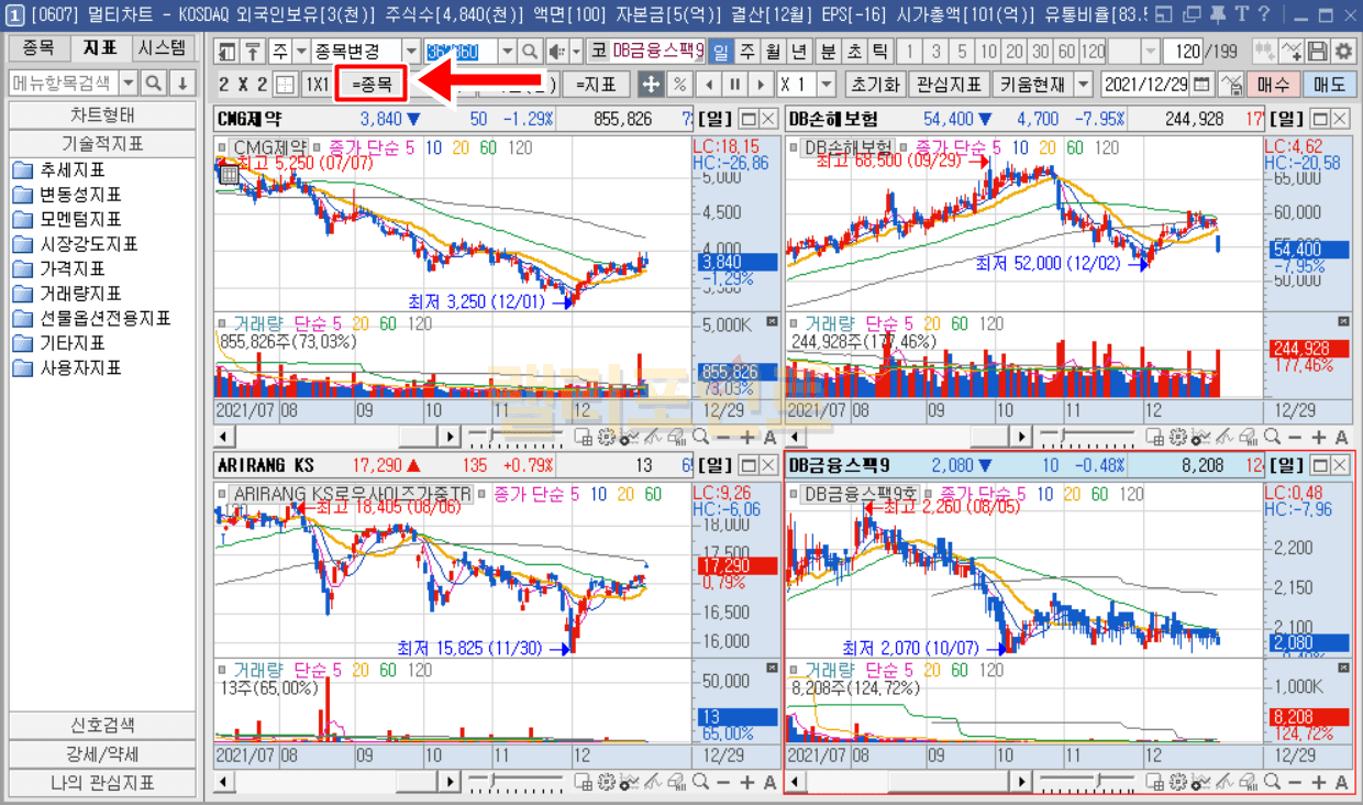 - 멀티차트 창에서 상단 =종목 버튼을 클릭합니다.