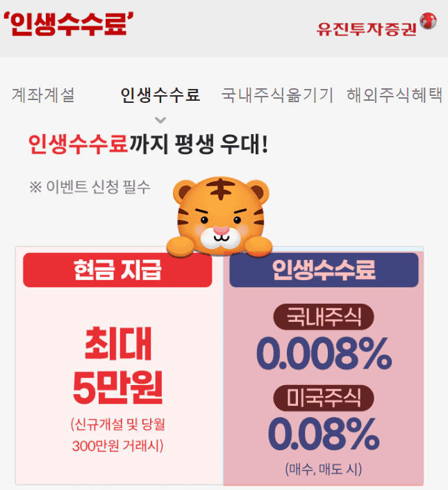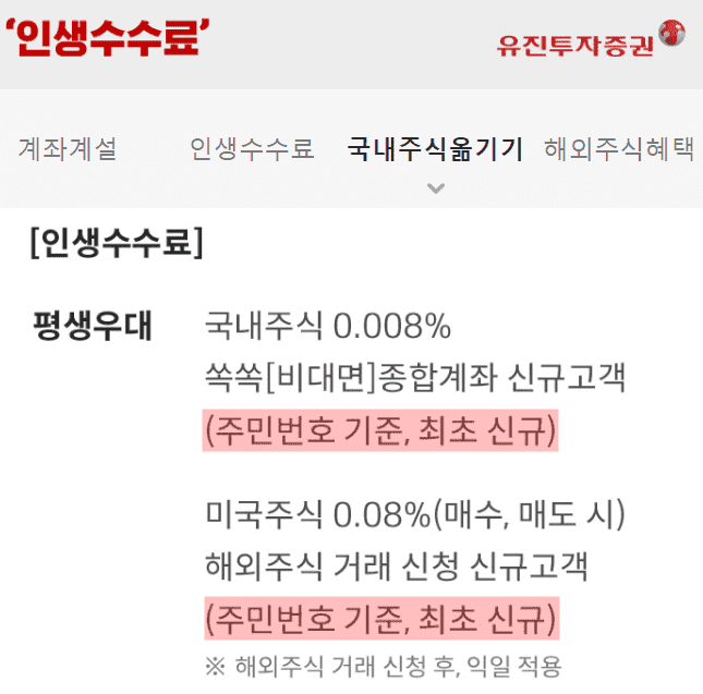 유진투자증권의 경우 현재 모바일 비대면 주식계좌 개설시 평생 우대로 국내주식 0.008% 및 미국주식 0.08%를 적용하고 있습니다. 기준은 주민번호로 최초 신규일 때 적용할 수 있는데요. 오랜 기간 유진투자증권에서는 이렇게 비대면 신규계좌는 평생 우대된 매매수수료를 적용해주었기에 해당 이벤트를 가입하셨더라면 저렴한 수수료를 적용받고 계실 것입니다.