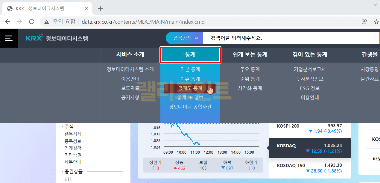 2. 통계 메뉴에서 공매도 통계를 클릭합니다.