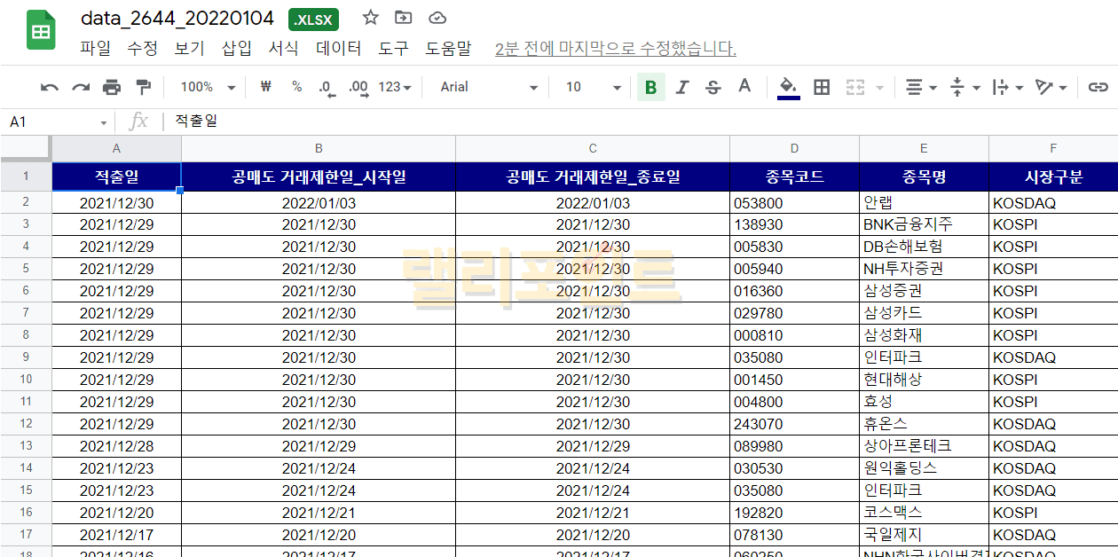 공매도 과열종목 확인시 거래제한 시작일과 종료일, 종목코드, 종목명, 시장구분, 직전 거래일 중 종목 거래일수, 공매도 비중, 주가 수익률, 공매도 거래대금 증가배율, 직전 40거래일 공매도 비중 평균, 지정유형 정보를 확인할 수 있습니다.