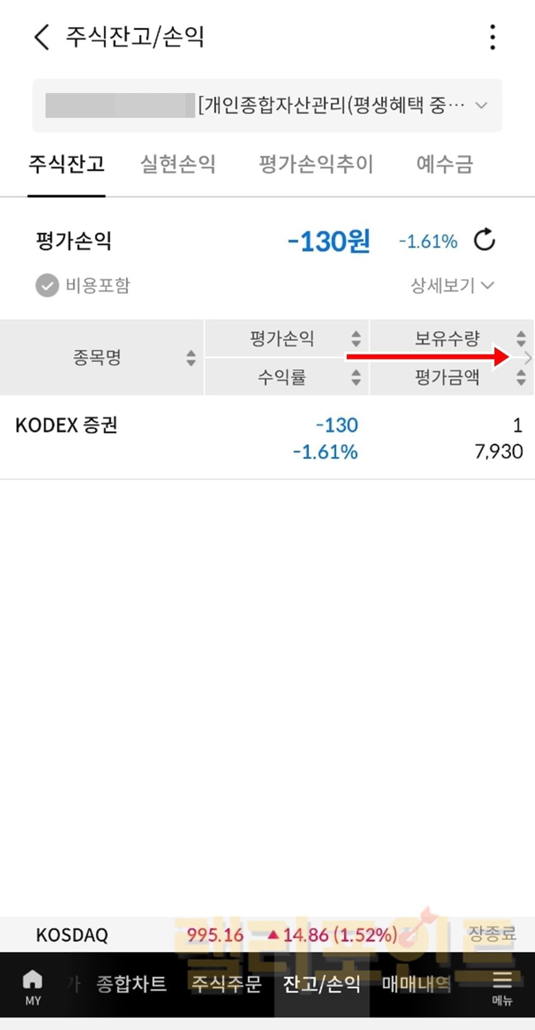 1. 보유종목 목록을 오른쪽으로 드래그합니다.