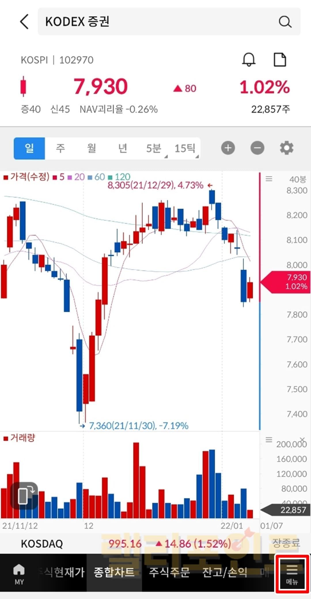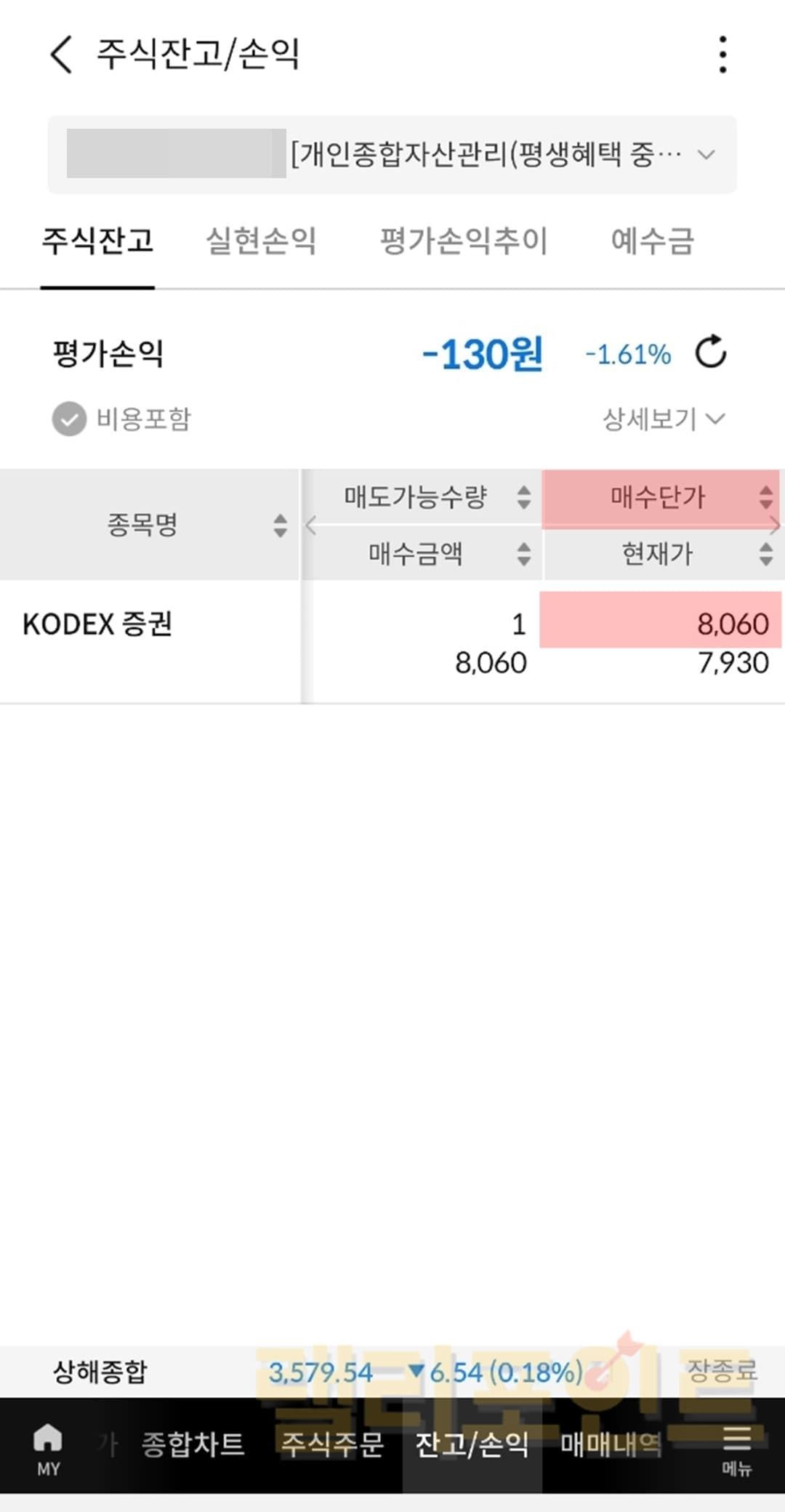 저의 경우 매수단가는 8,060이고 현재 주식은 7,930원임을 볼 수 있습니다. 그래서 평가손익은 -1.61%인 -130원이 표시되고 있는 것이죠.