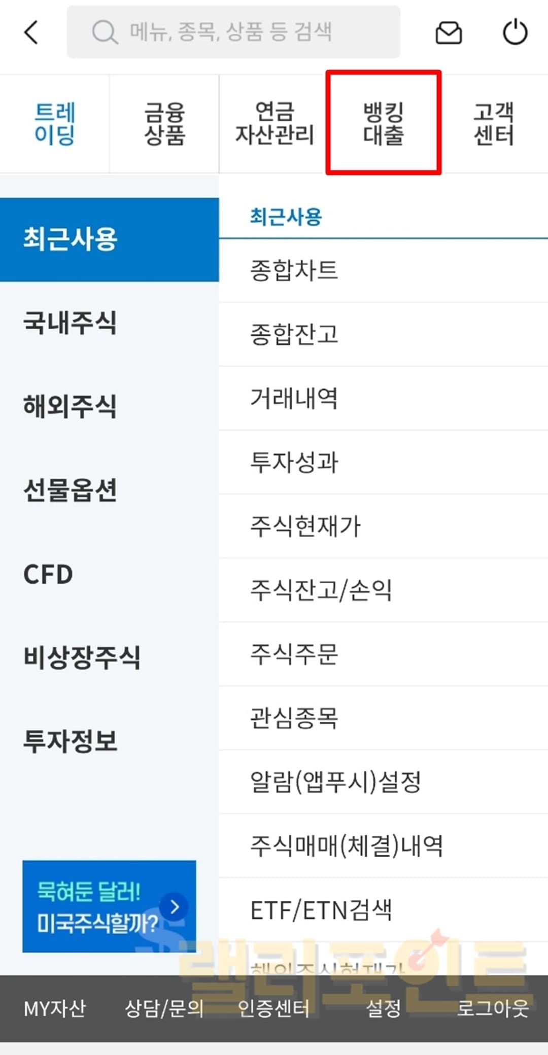 1. 뱅킹대출을 누릅니다.