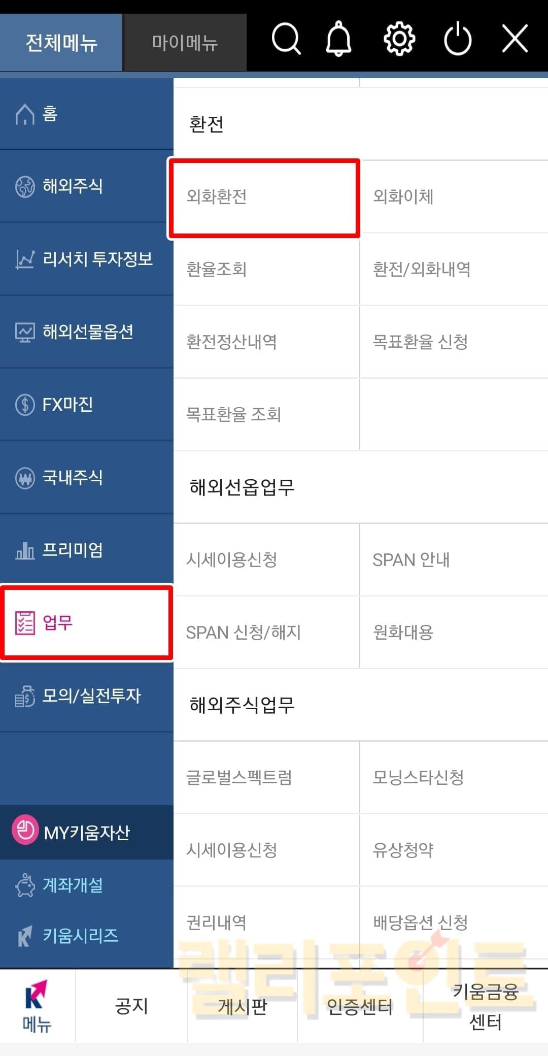 업무 > 환전 > 외화화전을 누릅니다.