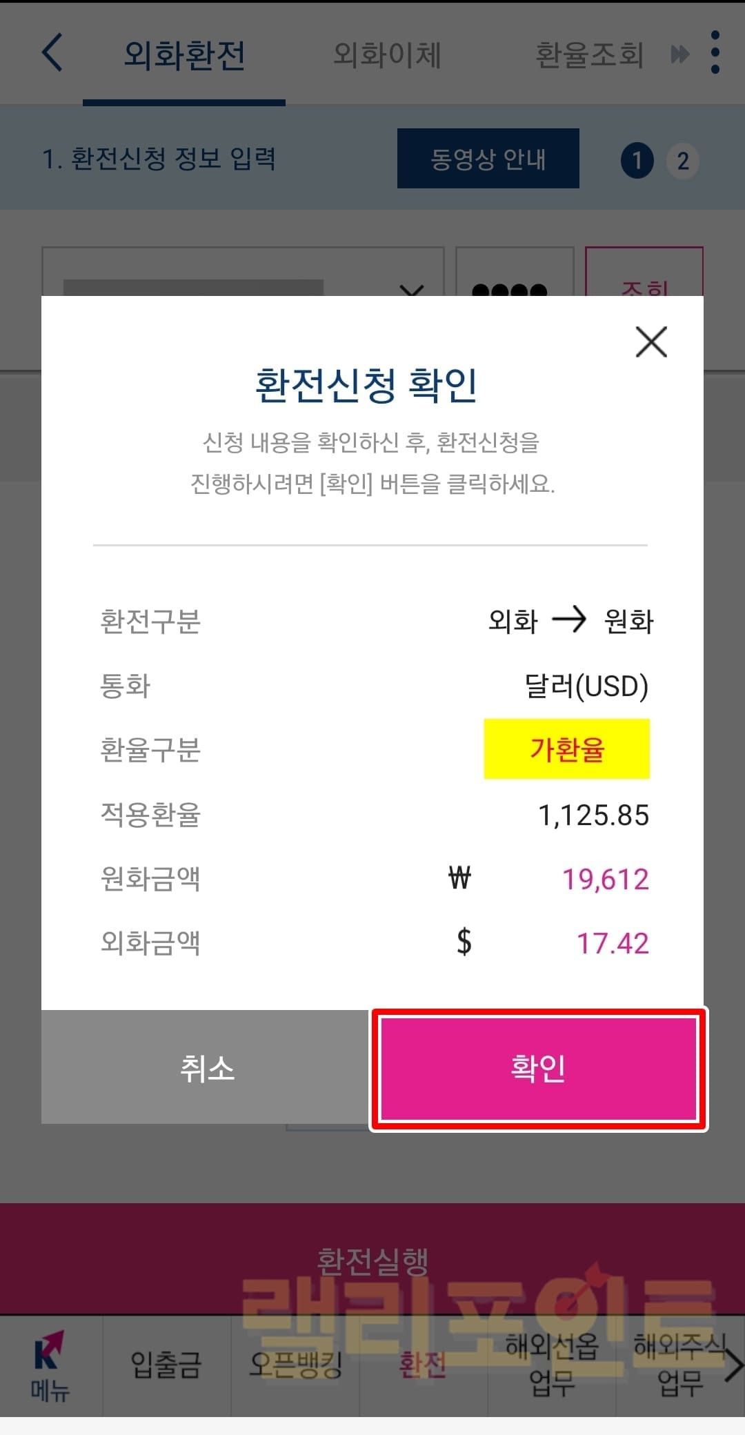 환전실행 버튼을 클릭합니다.