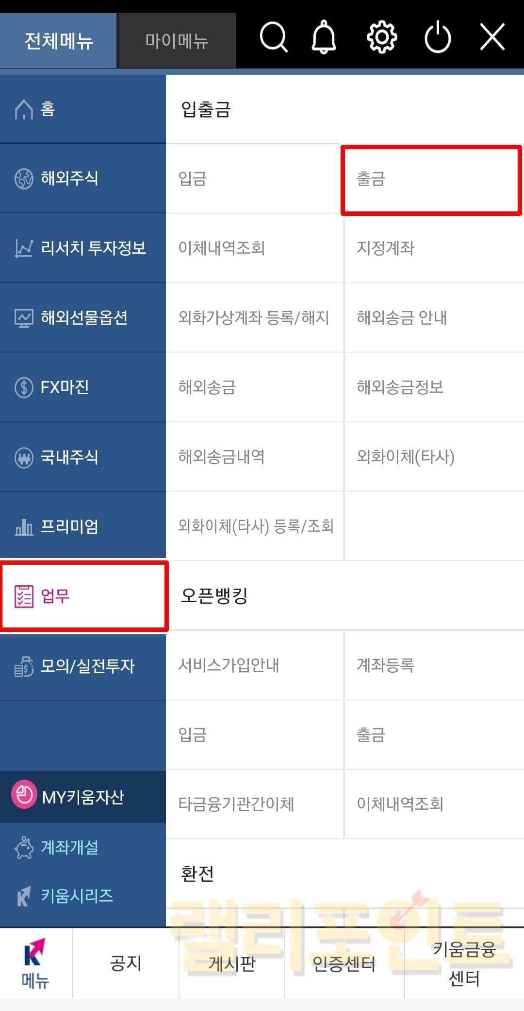 - 영웅문 글로벌S 메뉴에서 업무 > 입출금 > 출금을 클릭합니다.