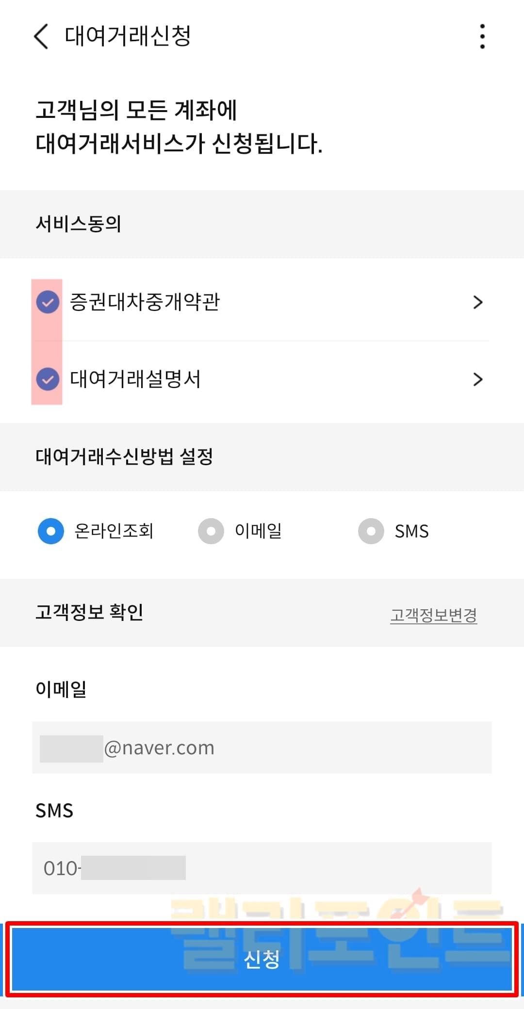대여거래수신방법 설정으로 온라인조회/이메일/SMS 중에서 선택할 수 있습니다. 주식 대여체결시 안내를 받을 수 있으니 확인하기 용이한 방법을 선택하세요.