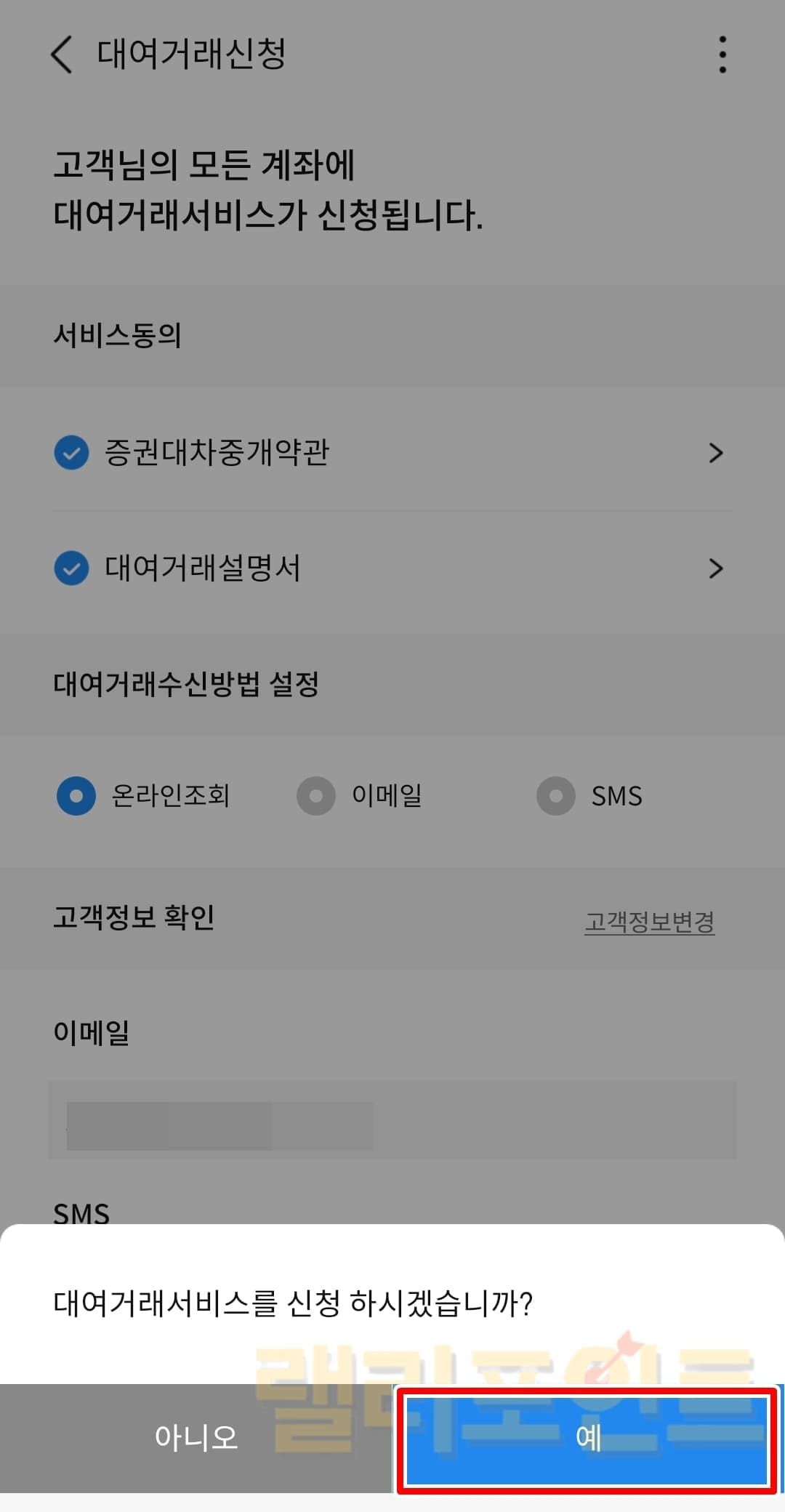 - 대여거래서비스 신청 안내에 예를 클릭합니다.