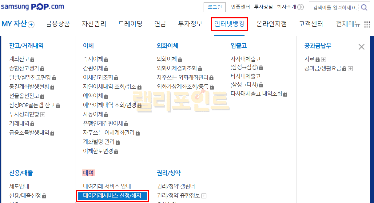 삼성증권 홈페이지에 로그인을 하고 인터넷 뱅킹 > 대여 > 대여거래서비스 신청/해지를 이용하시면 됩니다.