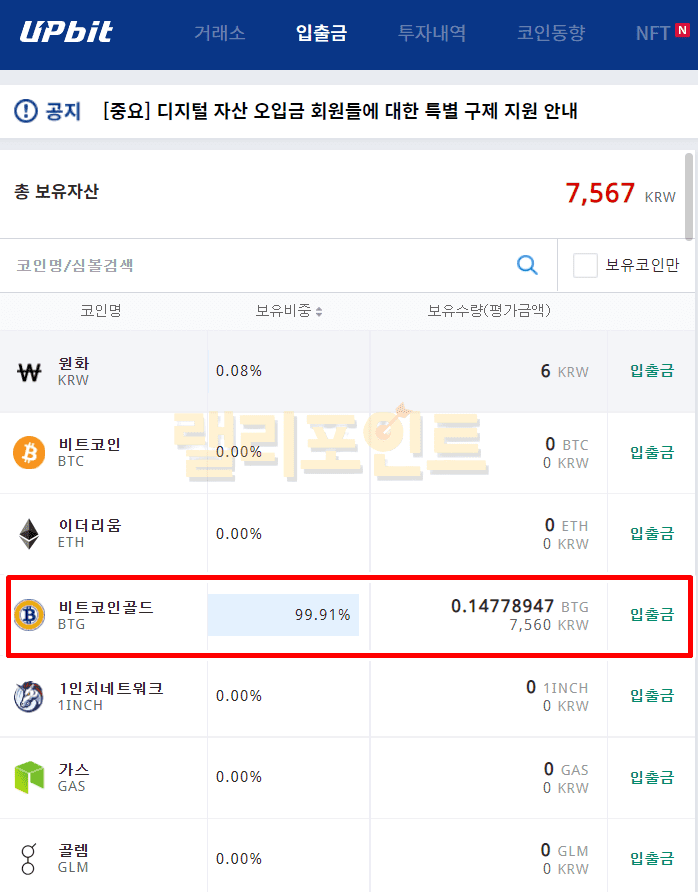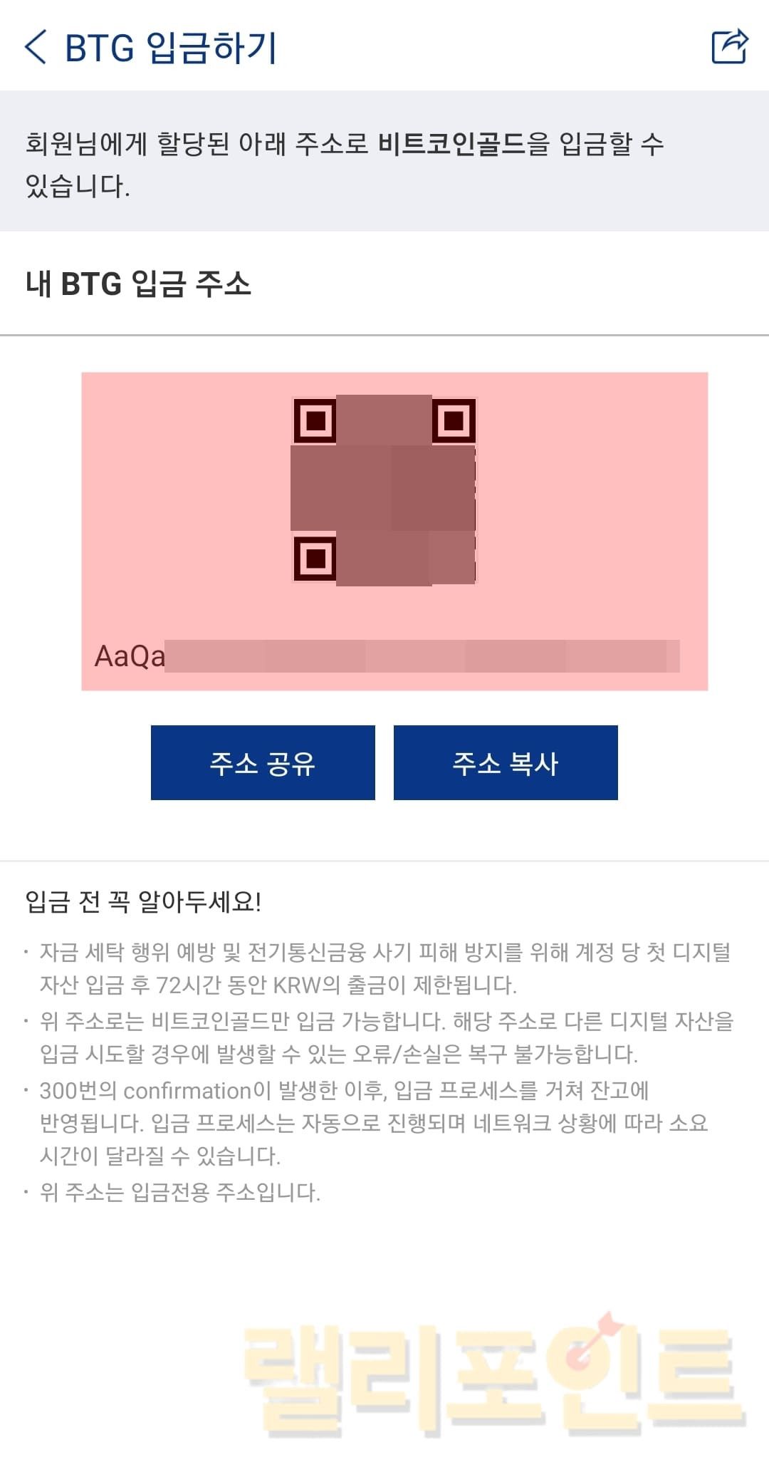• 코인별 지갑 주소가 다름으로 지갑 주소에 맞는 코인을 입출금하셔야 합니다. (비트코인골드 지갑은 비트코인골드만)