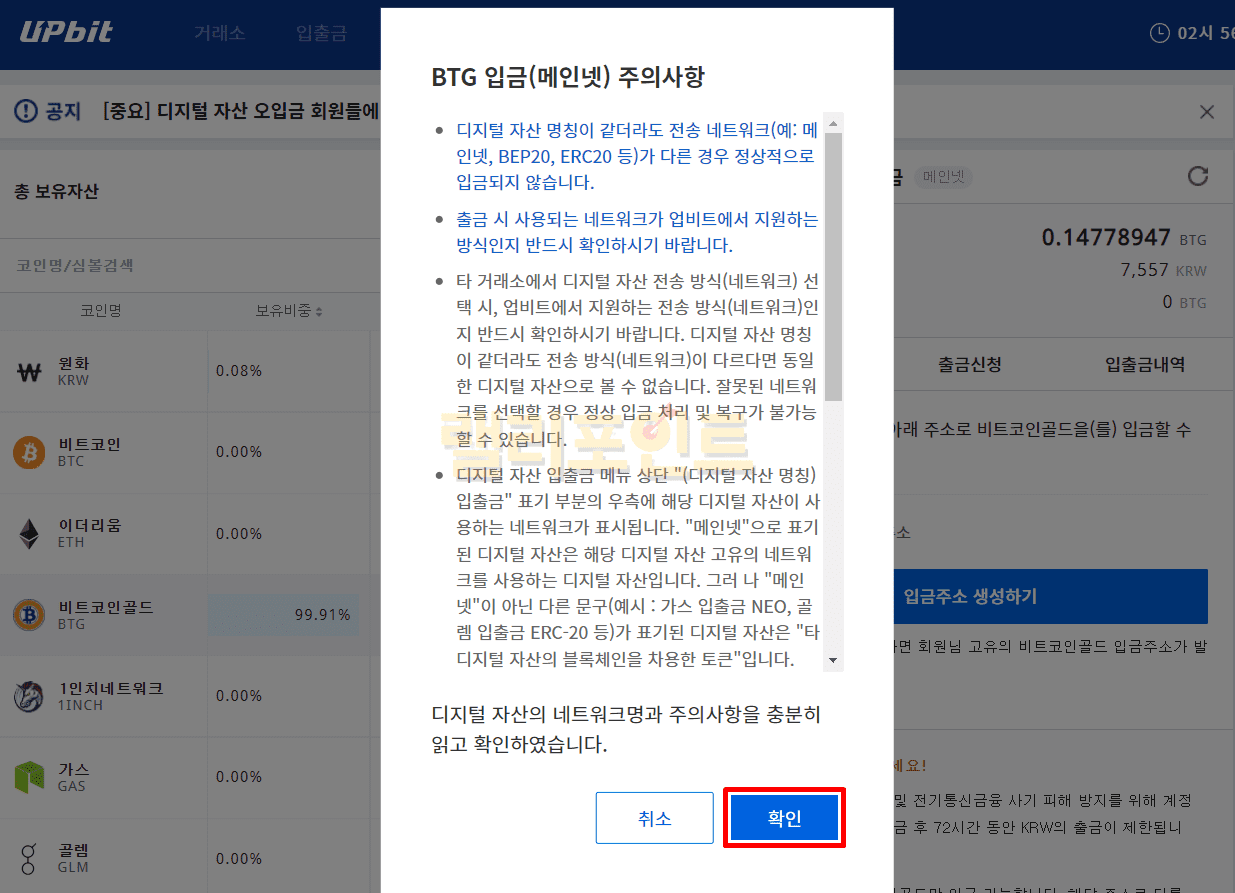 1. 코인 입금 주의사항에서 확인을 클릭합니다.