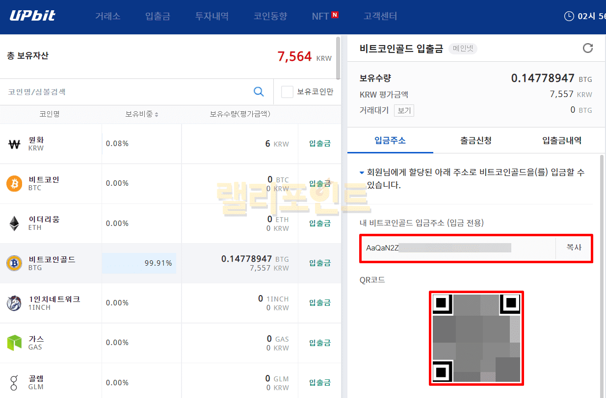 1. 내 코인 입금주소와 QR코드를 확인합니다.