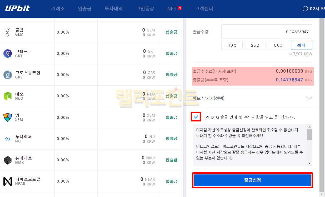 3. 출금신청을 누르면 입력한 지갑 주소로 코인이 출금됩니다.
