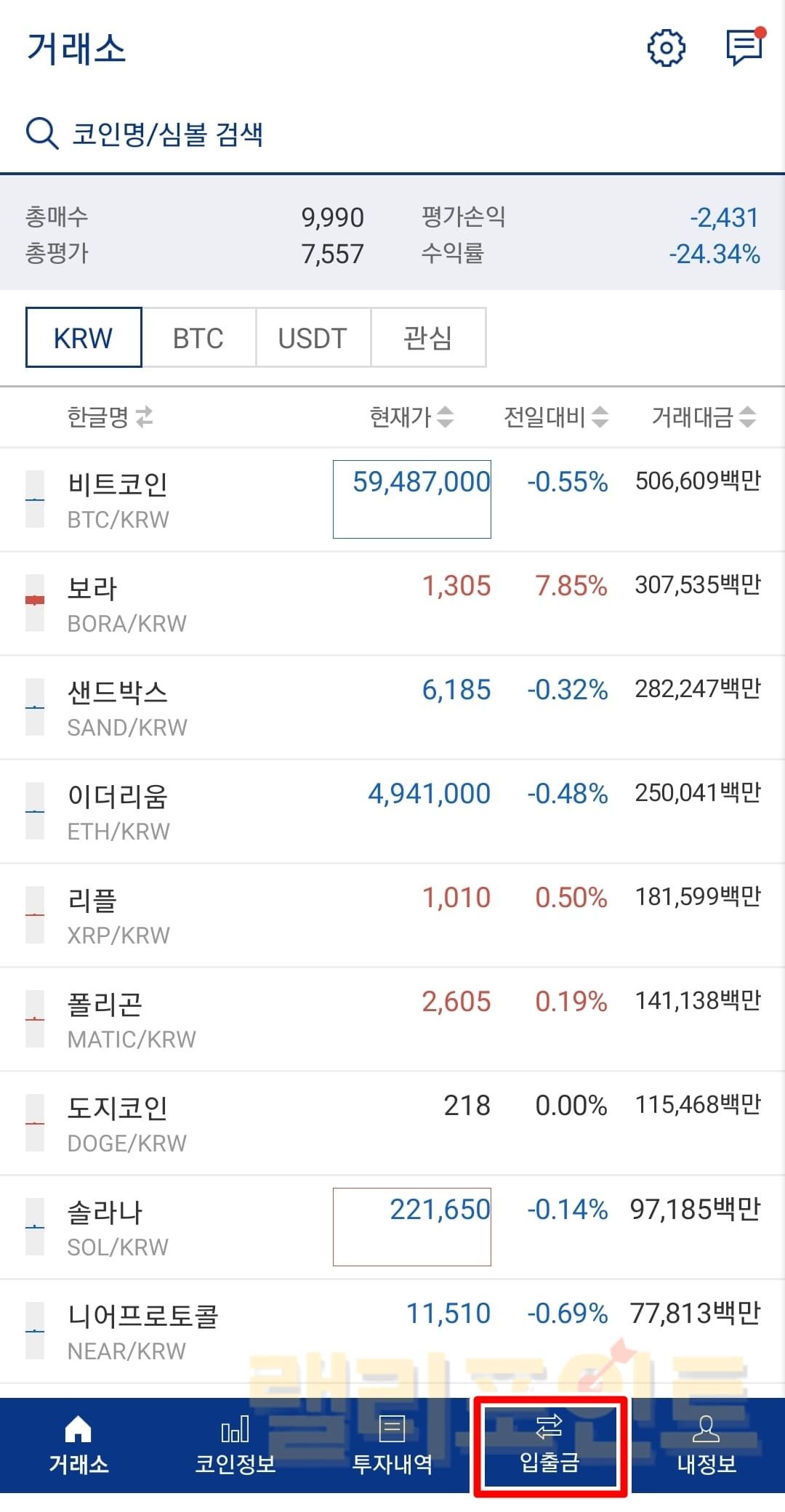 1. 상단에서 입출금 메뉴를 누릅니다.