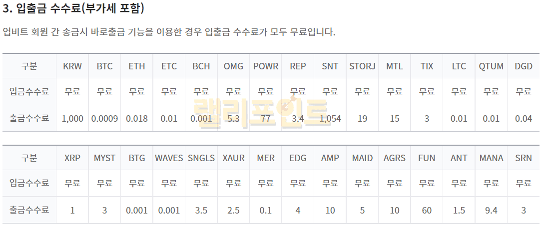 모든 코인 입금수수료는 무료이며 출금수수료는 코인별로 상이합니다. 아래는 주요 코인의 출금 수수료이니 참고바라며 궁금한 코인 출금 수수료가 있다면 https://upbit.com/service_center/guide에서 확인해보세요.