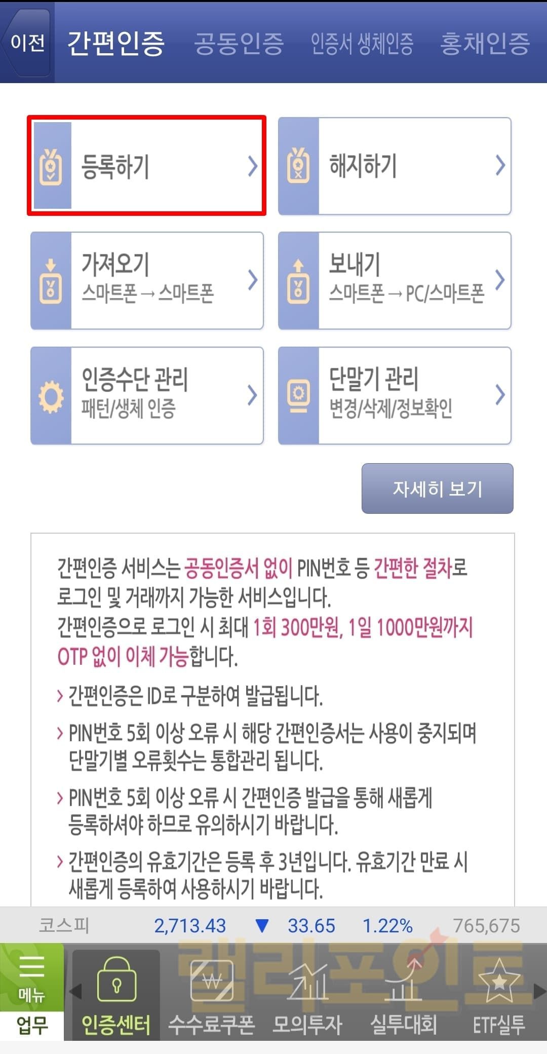 이렇게 사용되는 영웅문 간편인증은 공동인증서 없이 로그인 및 거래까지 가능하며 최대 1회 300만원, 1일 1,000만원까지 OTP없이 이체가 가능합니다. 간편인증의 유효기간은 등록 후 3년이니 유효기간 만료시 새롭게 등록해서 계속 사용하시면 됩니다.