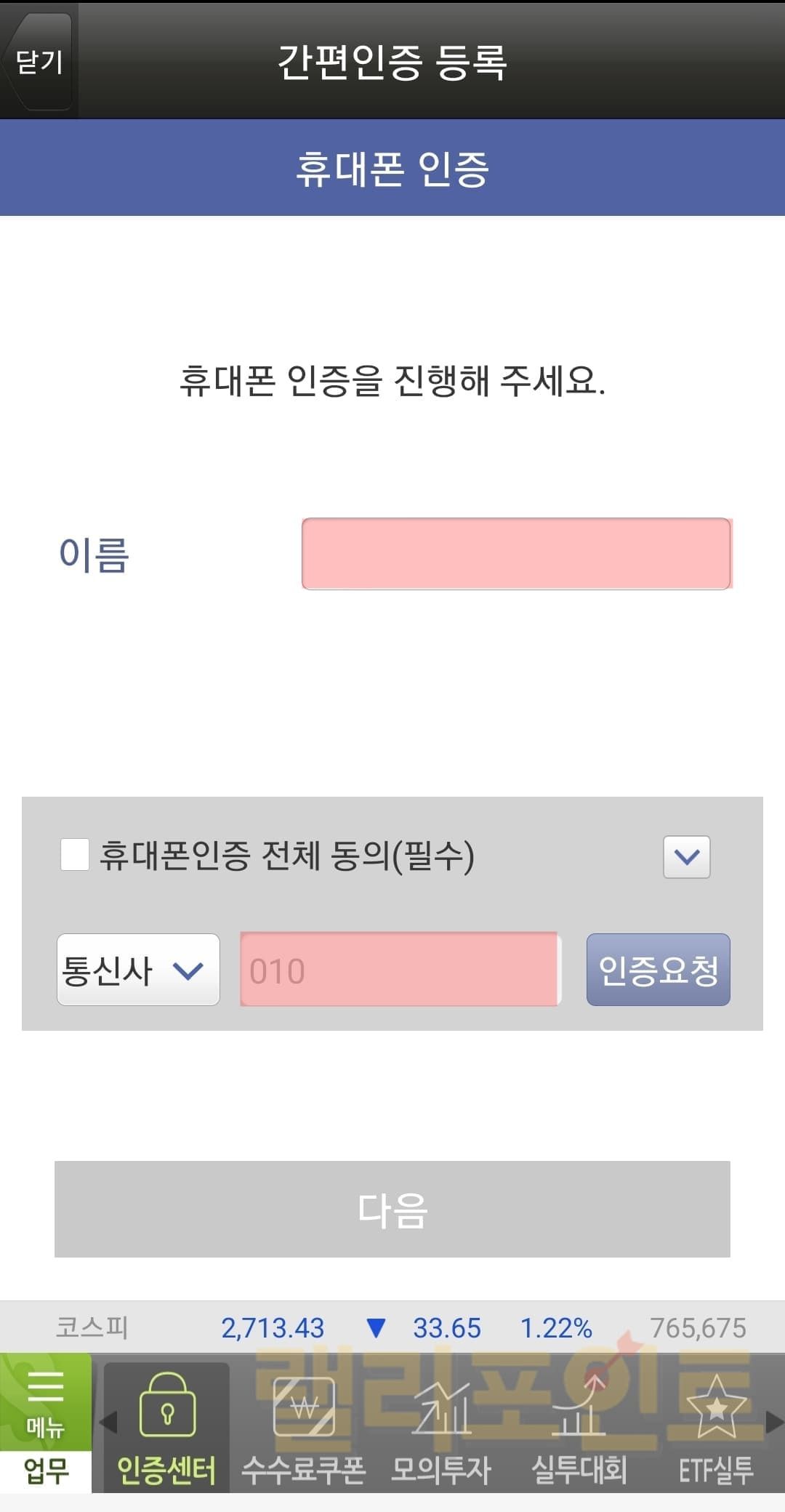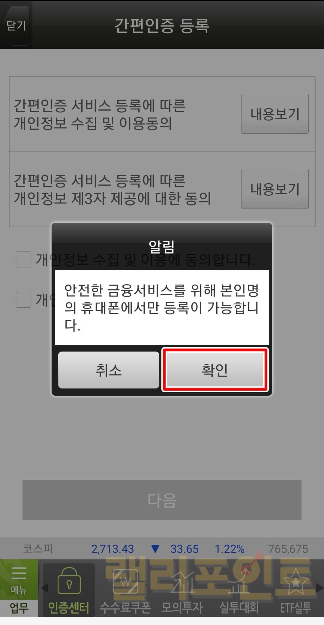 키움증권 영웅문 간편인증은 본인명의 휴대폰에서만 등록 및 사용이 가능합니다.