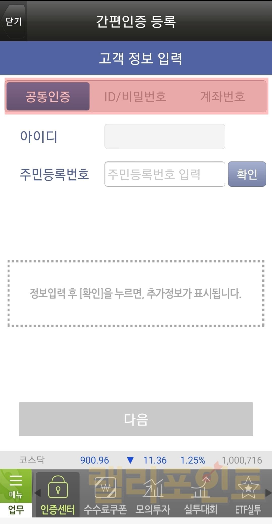 - 공동인증, ID/비밀번호, 계좌번호 중 선택해서 인증합니다.