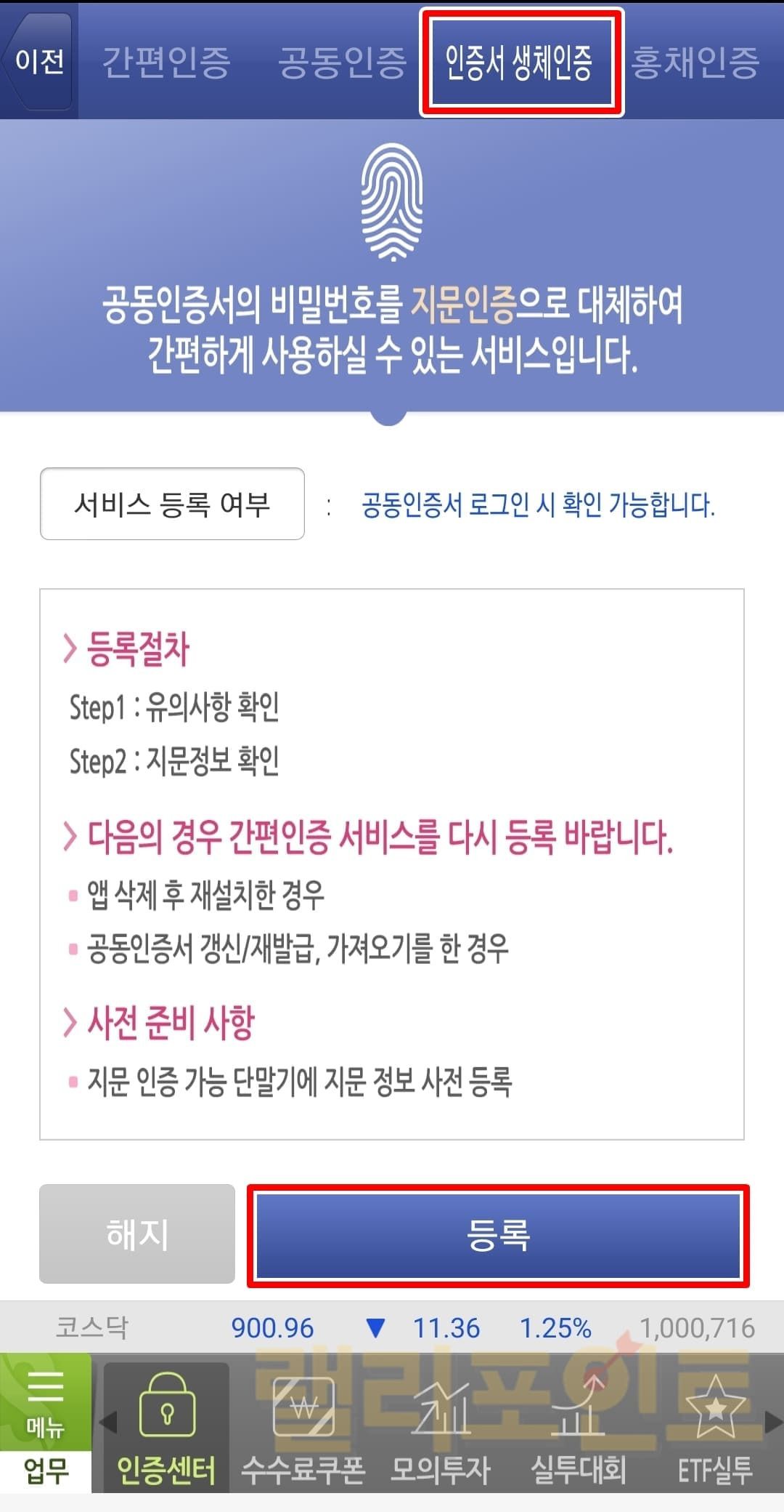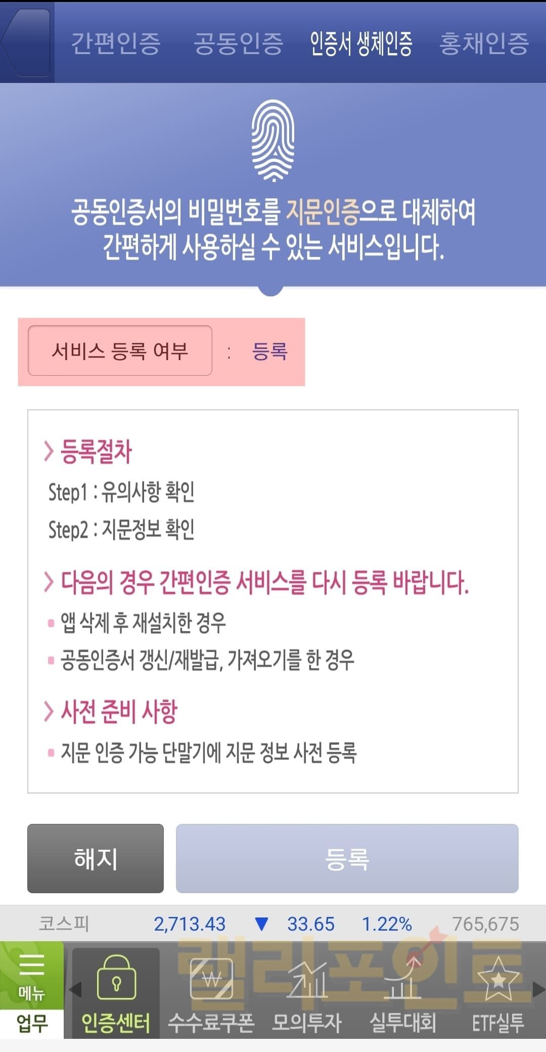 영웅문 생체 지문인증이란 공동인증서로 로그인해야 사용 가능한 업무, 기능을 이용할 때 공동인증서 비밀번호 입력 절차를 생략해주고 지문으로 로그인하는 기능입니다.