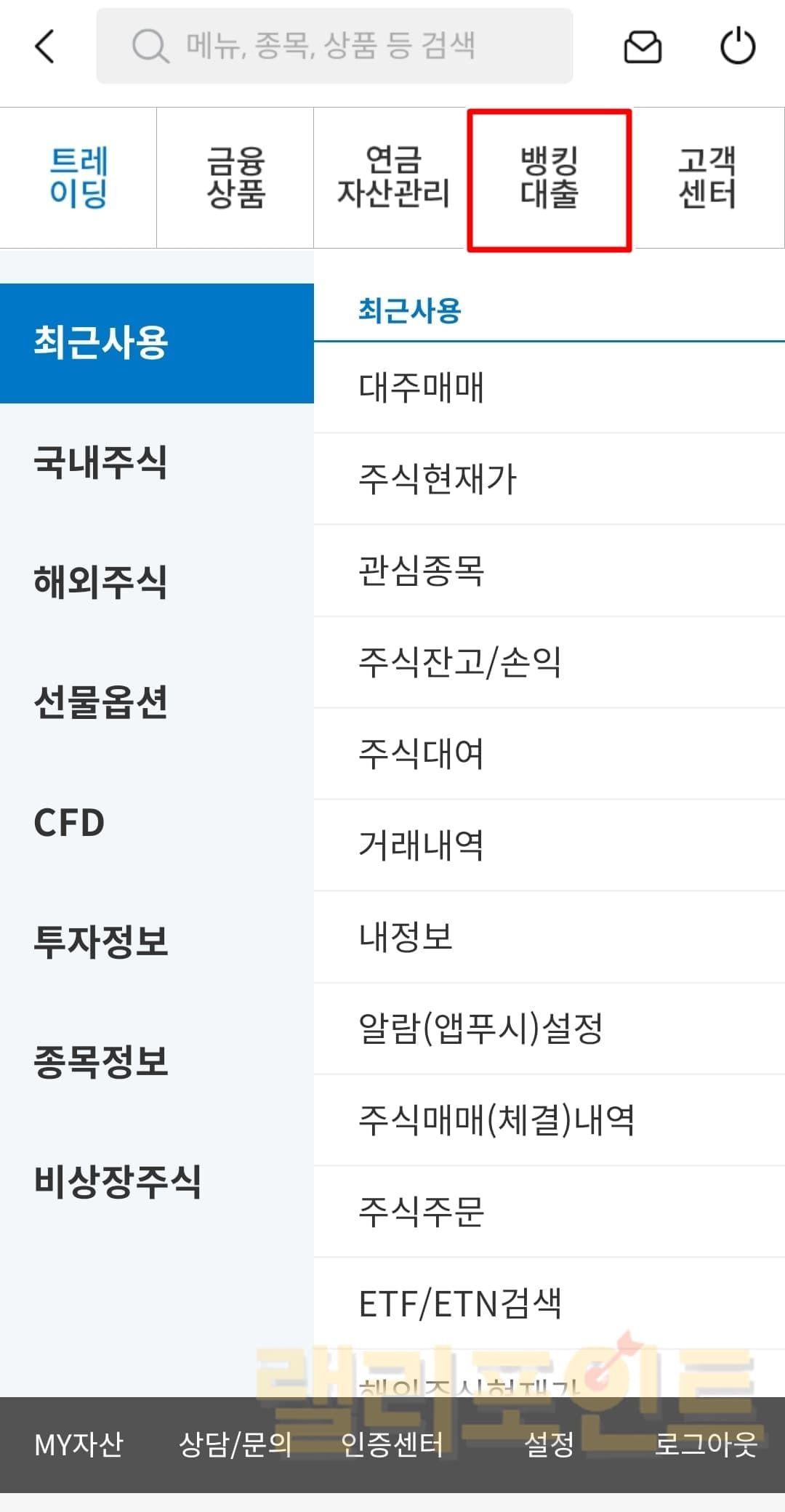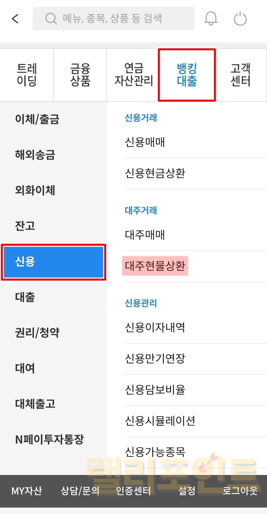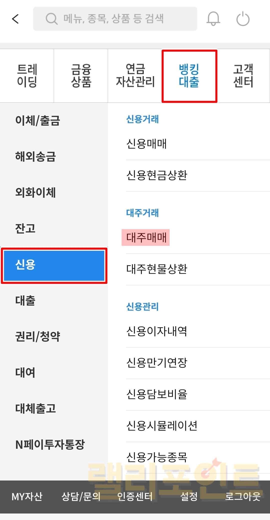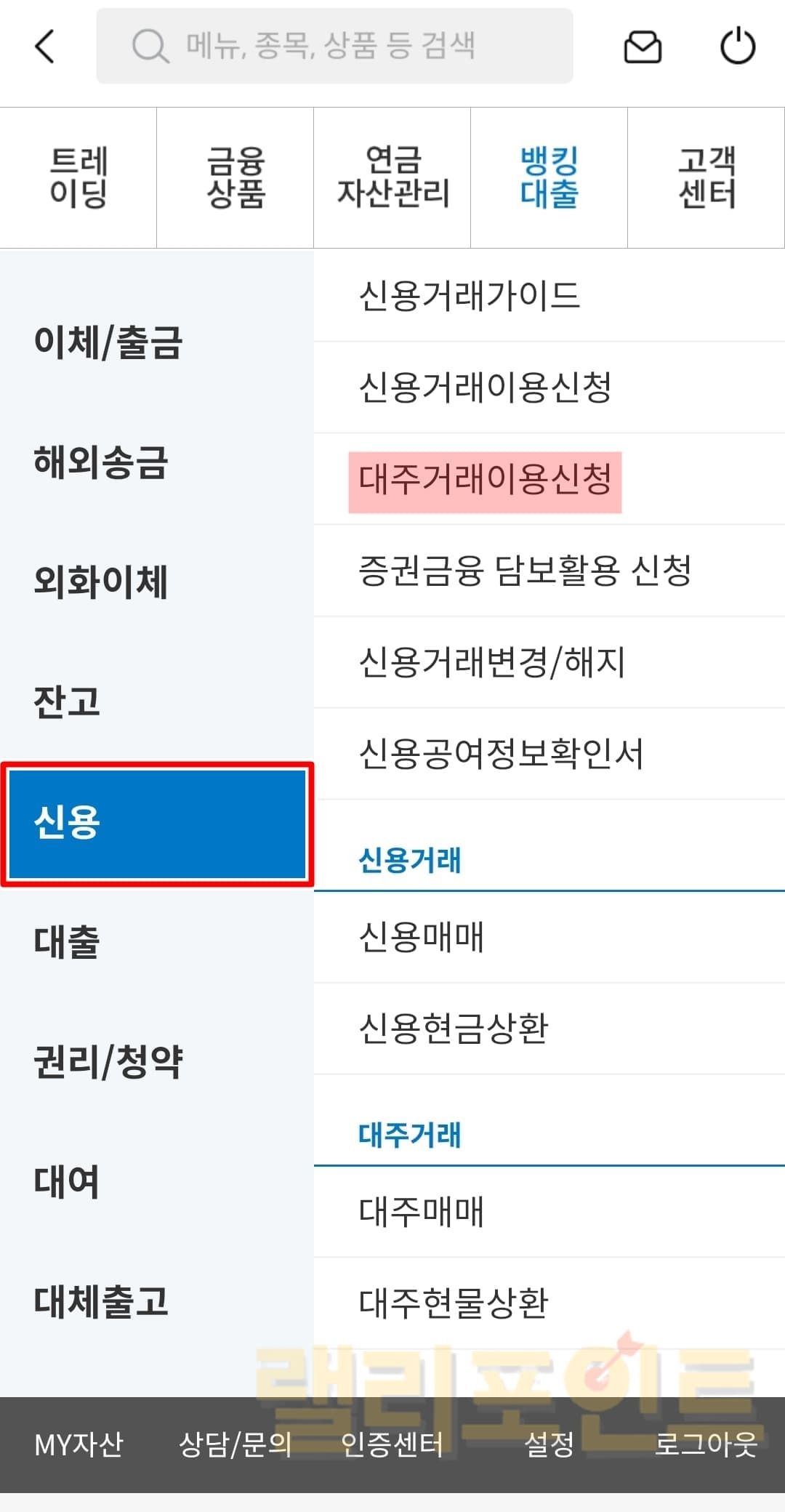 MTS 메뉴에서 뱅킹대출 > 신용 > 대주매매로 들어가서 투자를 진행합니다.