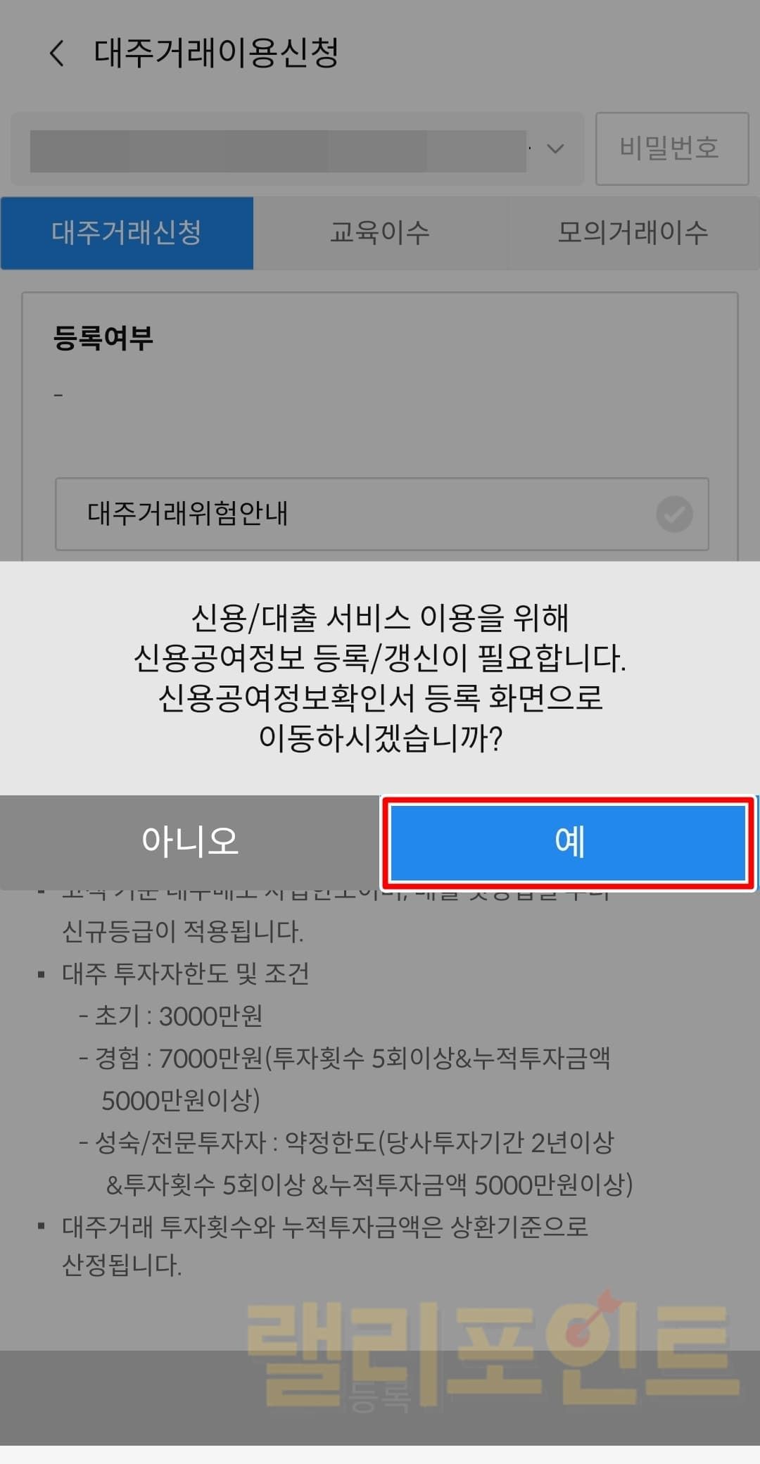 1. 신용공여 정보 등록/갱신 안내에 예를 누릅니다.