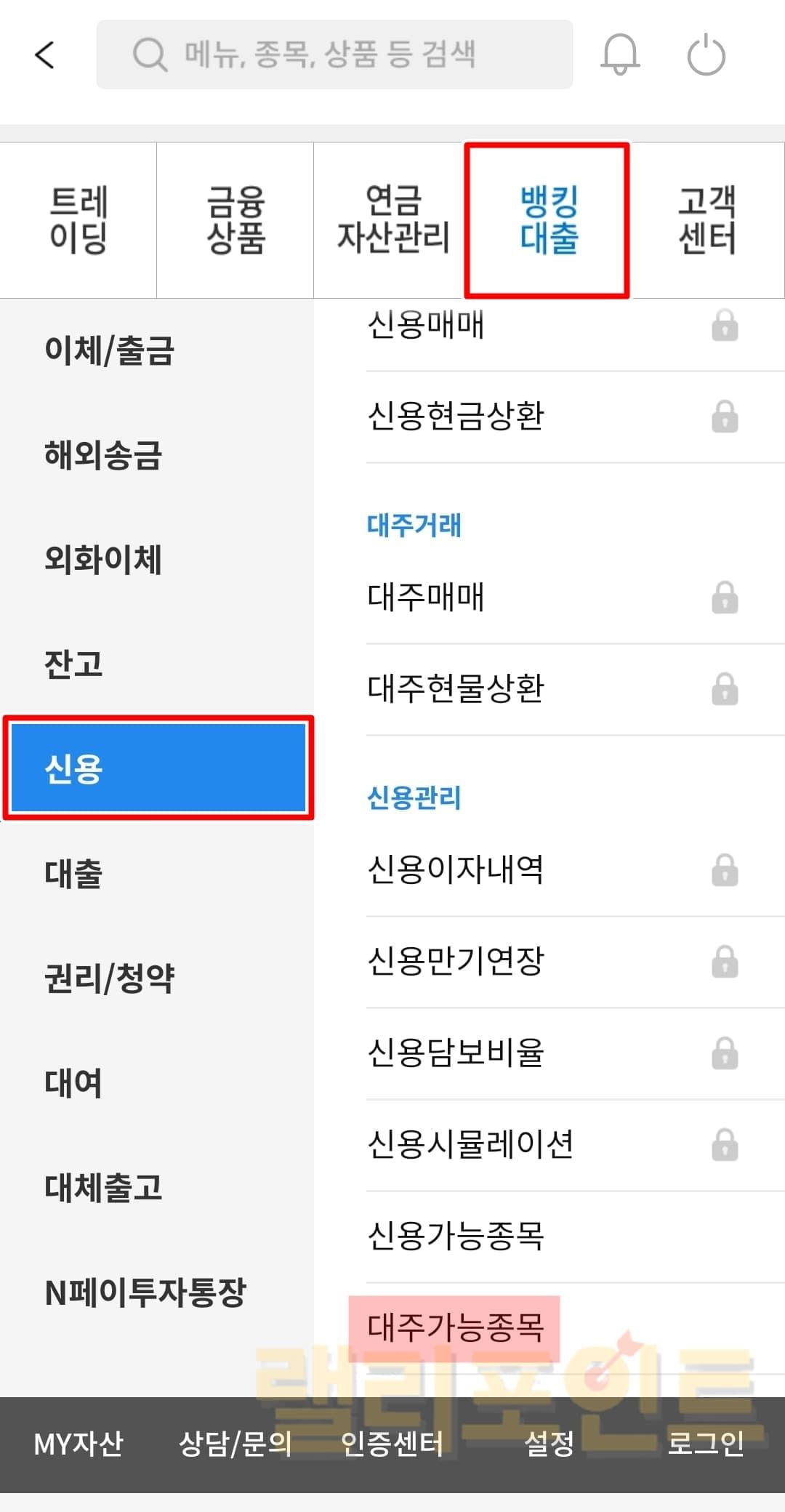 1. MTS 메뉴에서 뱅킹대출 > 신용 > 대주가능종목을 누릅니다.