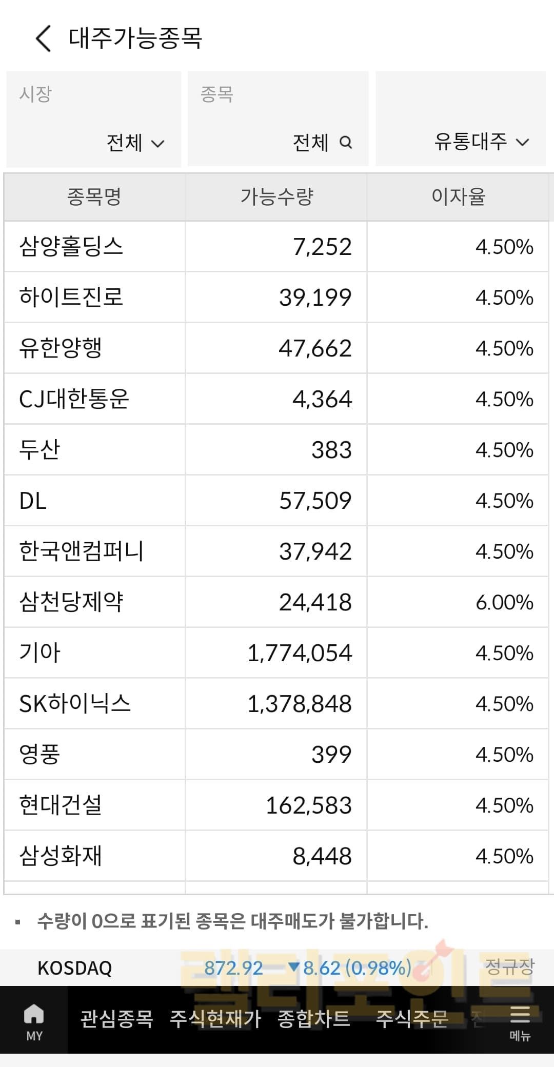 1. 대주가능종목과 수량 및 이자율을 확인합니다.