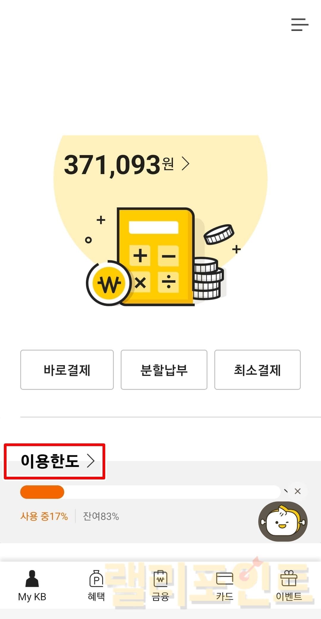 MY KB 홈에서 이용한도를 클릭합니다.