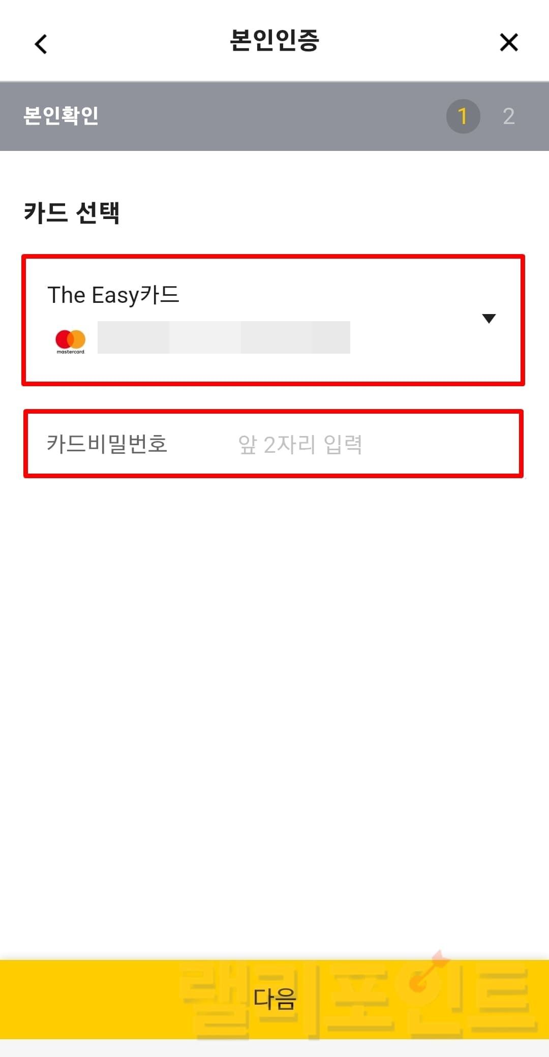 카드비밀번호 앞 2자리를 입력하고 다음을 누릅니다.