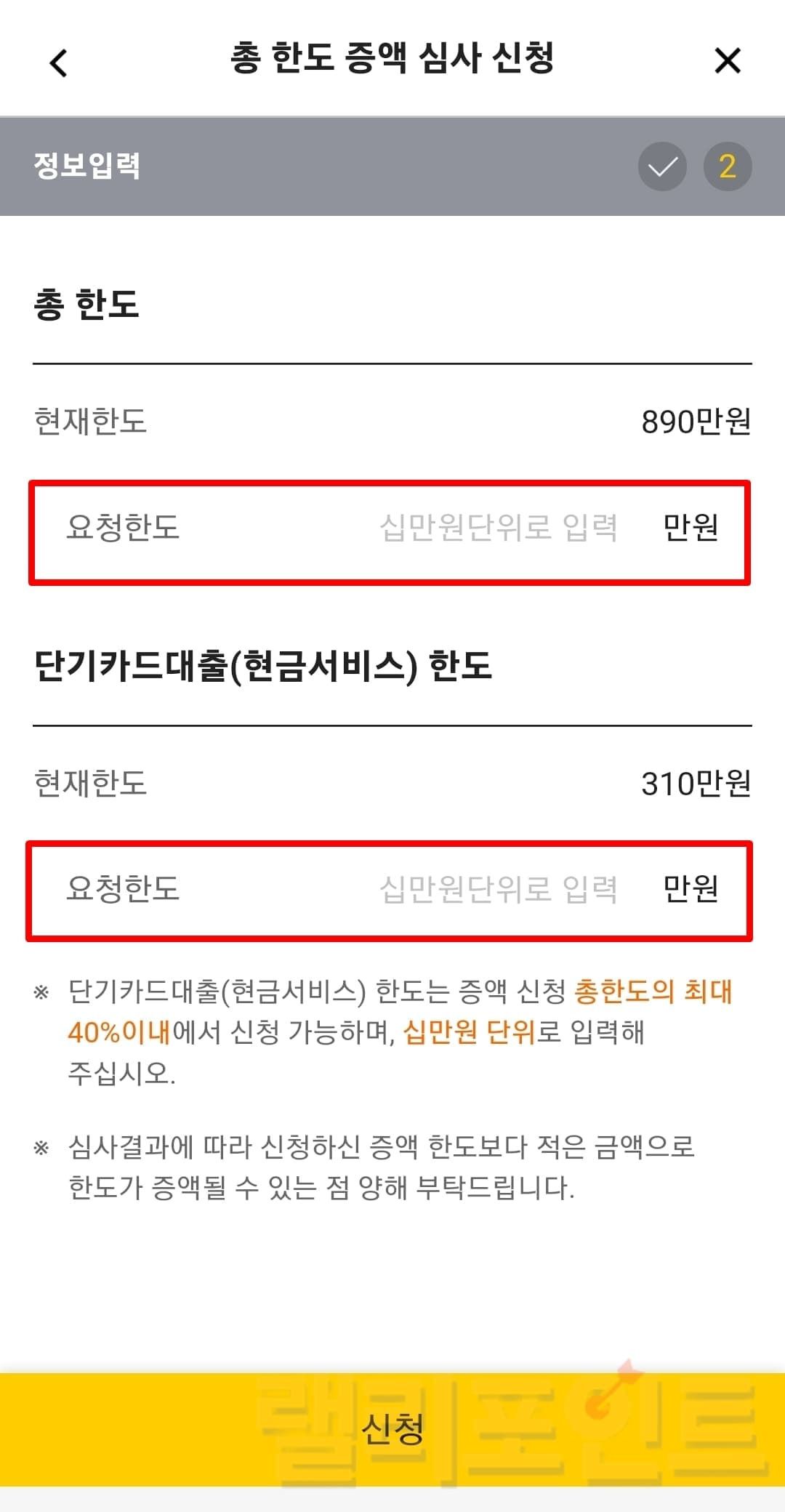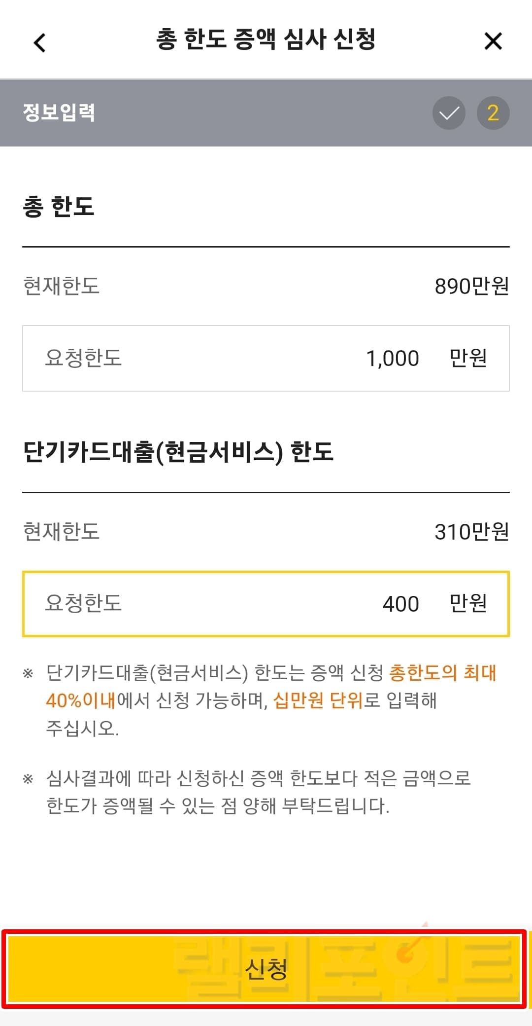 저는 총 한도를 1,000만원, 단기카드대출 한도를 400만원으로 기입해서 증액하였습니다. 이 때 단기카드대출 한도의 경우 증액 신청 총한도의 최대 40%내에서만 신청가능하며 십만원 단위로 입력해야 합니다.