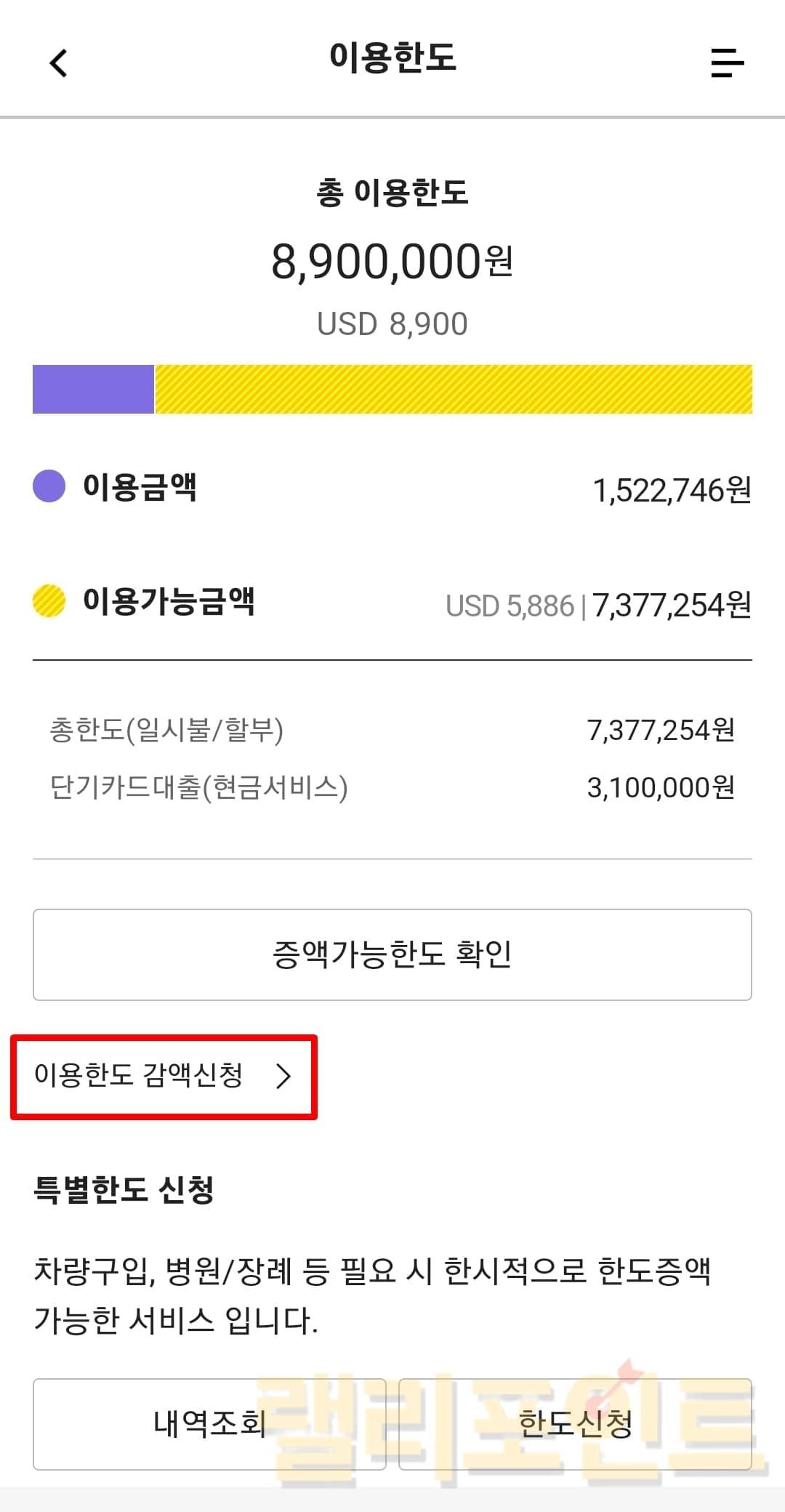 한도감액 이후 미청구금액에 따라서 이용가능금액이 부족할 수 있으니 주의하세요.
