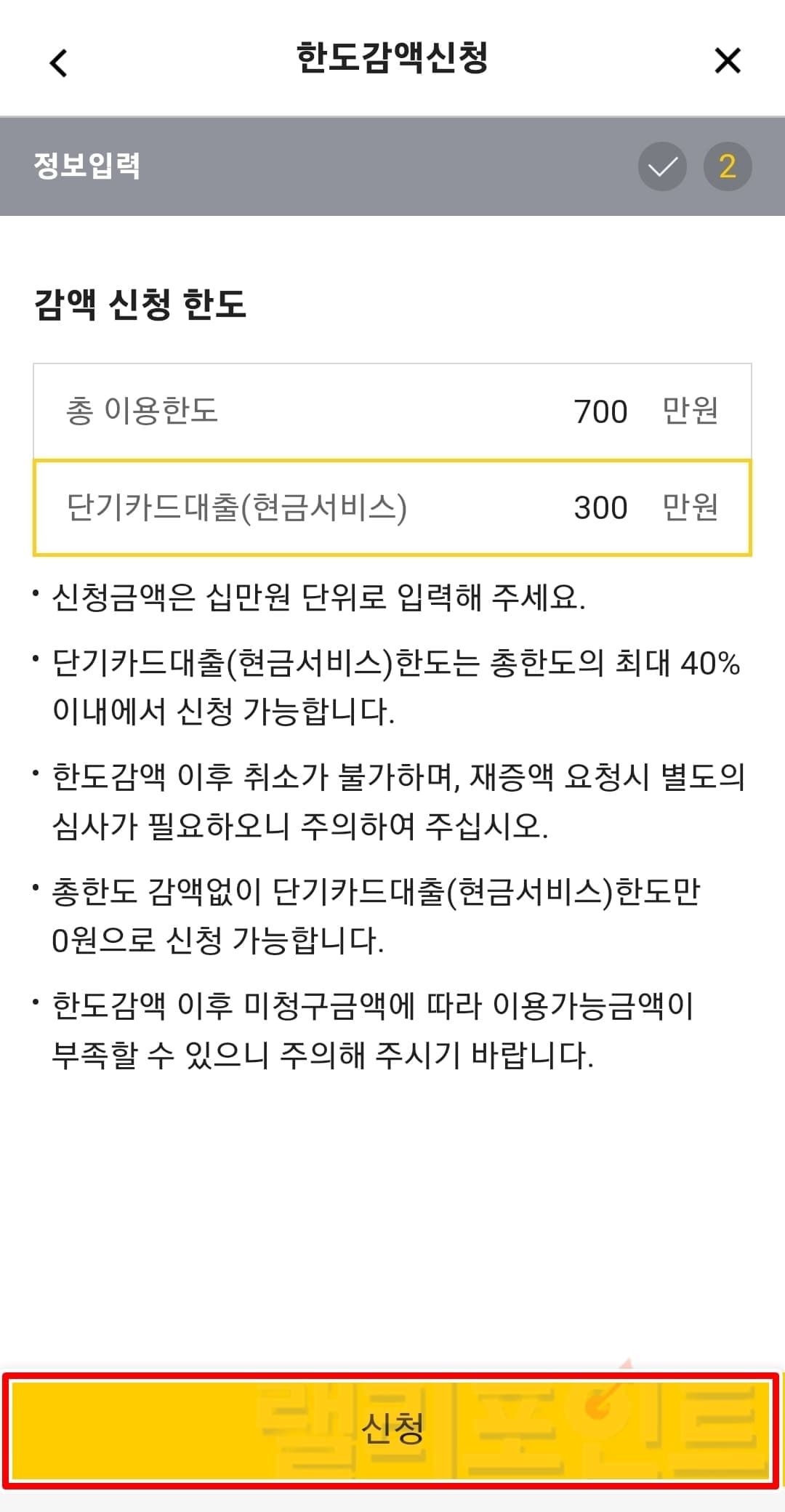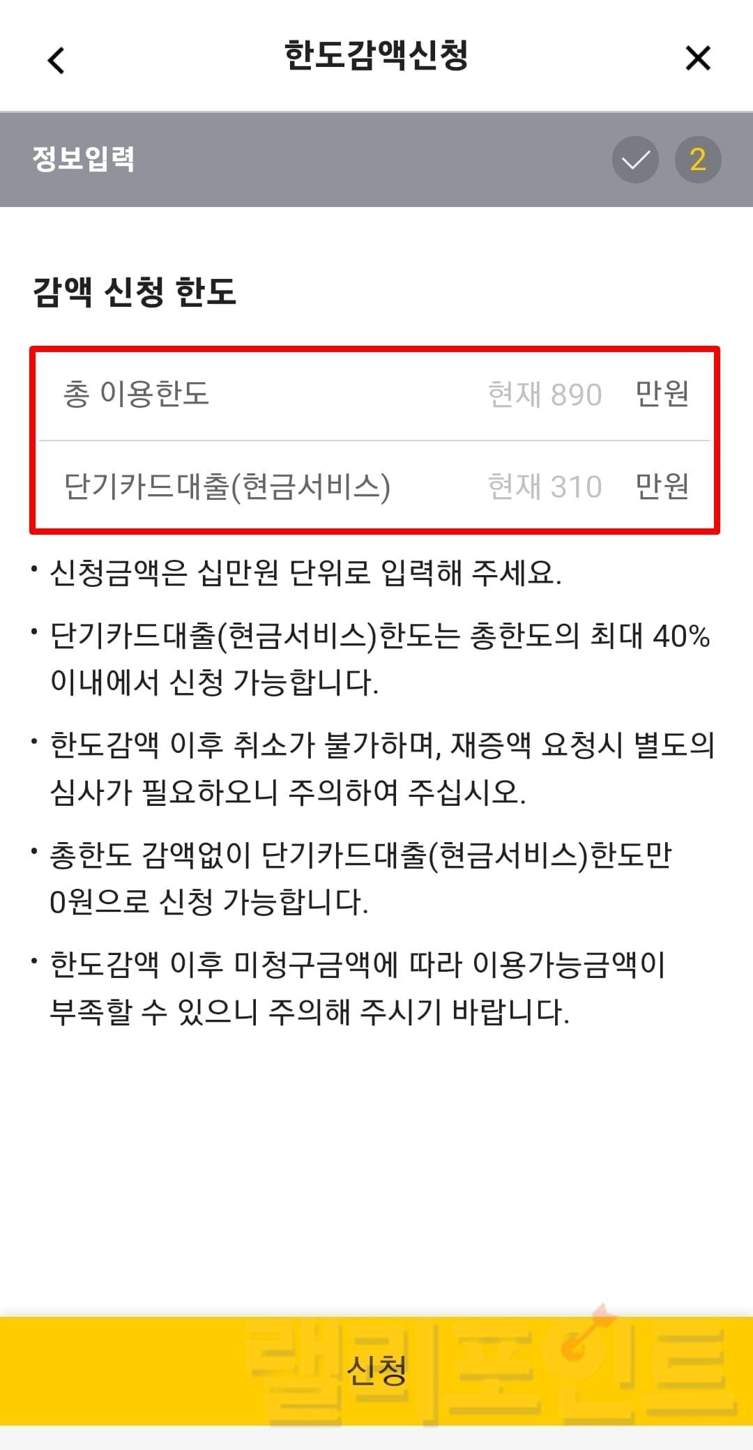 - 신청을 클릭하면 카드 한도가 감액됩니다