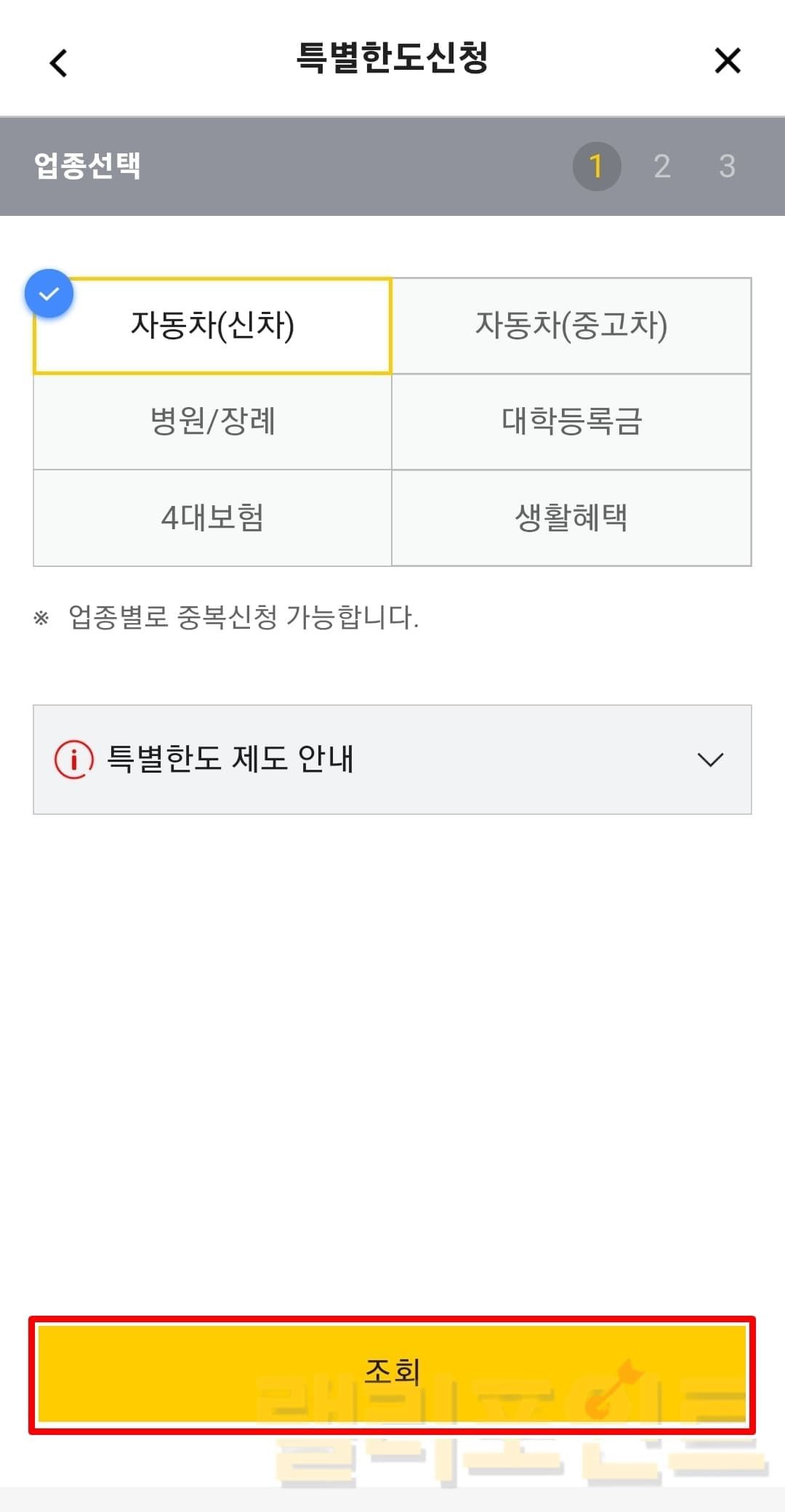 특별한도 조회/신청을 누르고 업종을 선택하여 심사를 받으시면 됩니다.