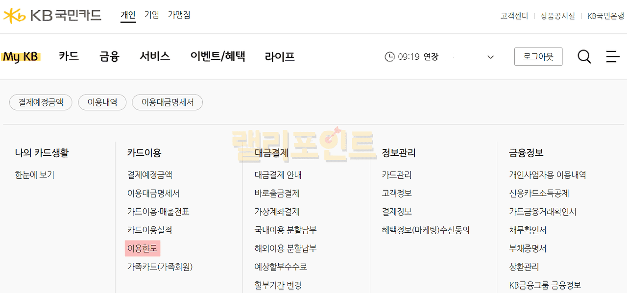 - MY KB > 카드이용 > 이용한도를 누릅니다.