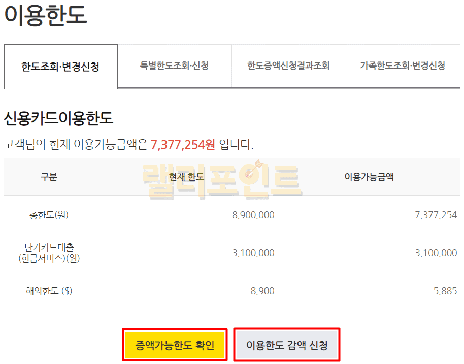 - 증액가능한도 확인 또는 이용한도 감액 신청을 클릭합니다.