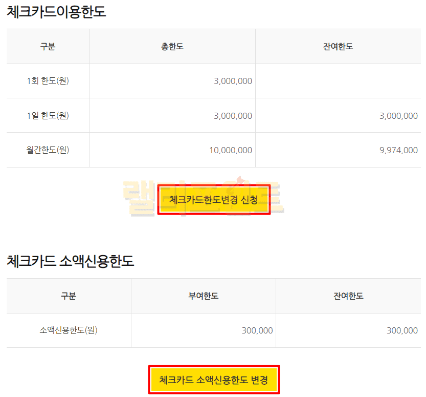 체크카드 이용한도 및 소액신용한도 변경하기