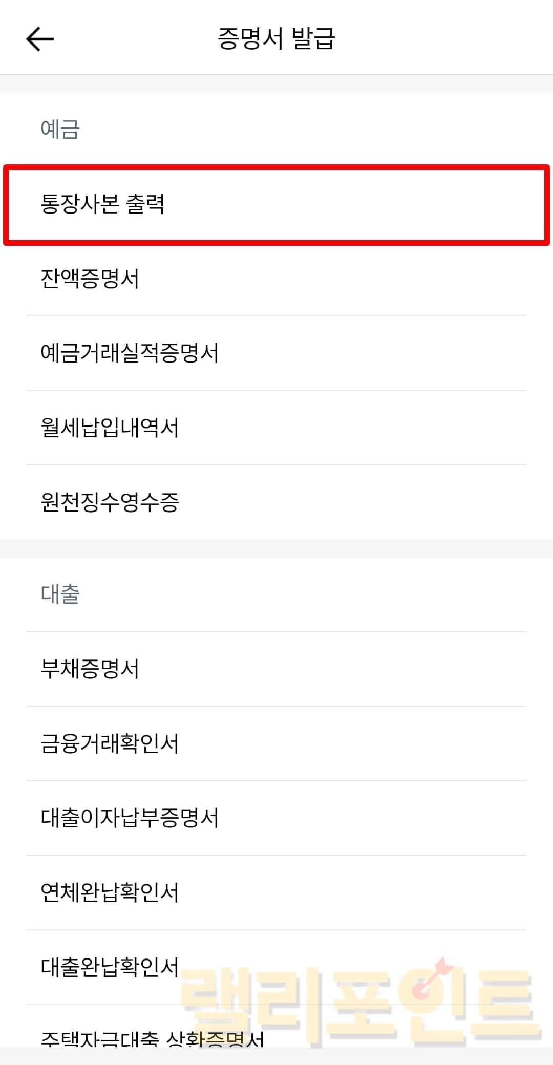 1. 통장사본 출력을 선택합니다.