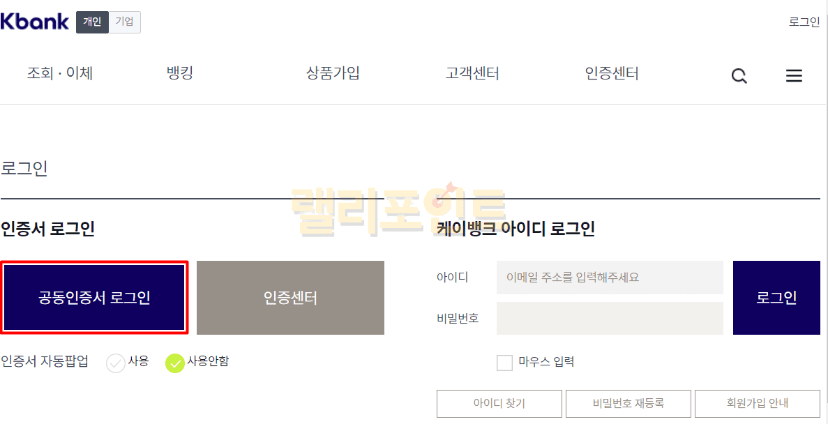 1. 케이뱅크 사이트에서 로그인을 클릭합니다.