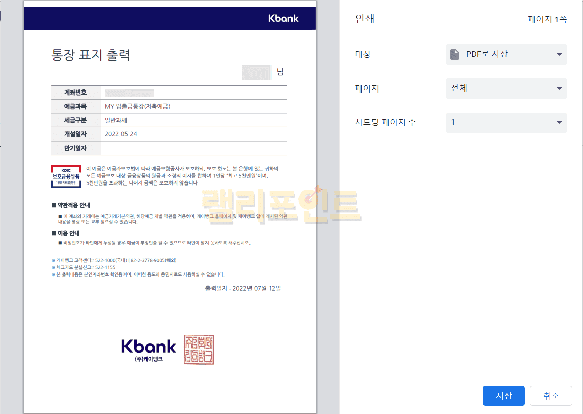 1. 케이뱅크 통장사본 출력 및 저장이 가능합니다.