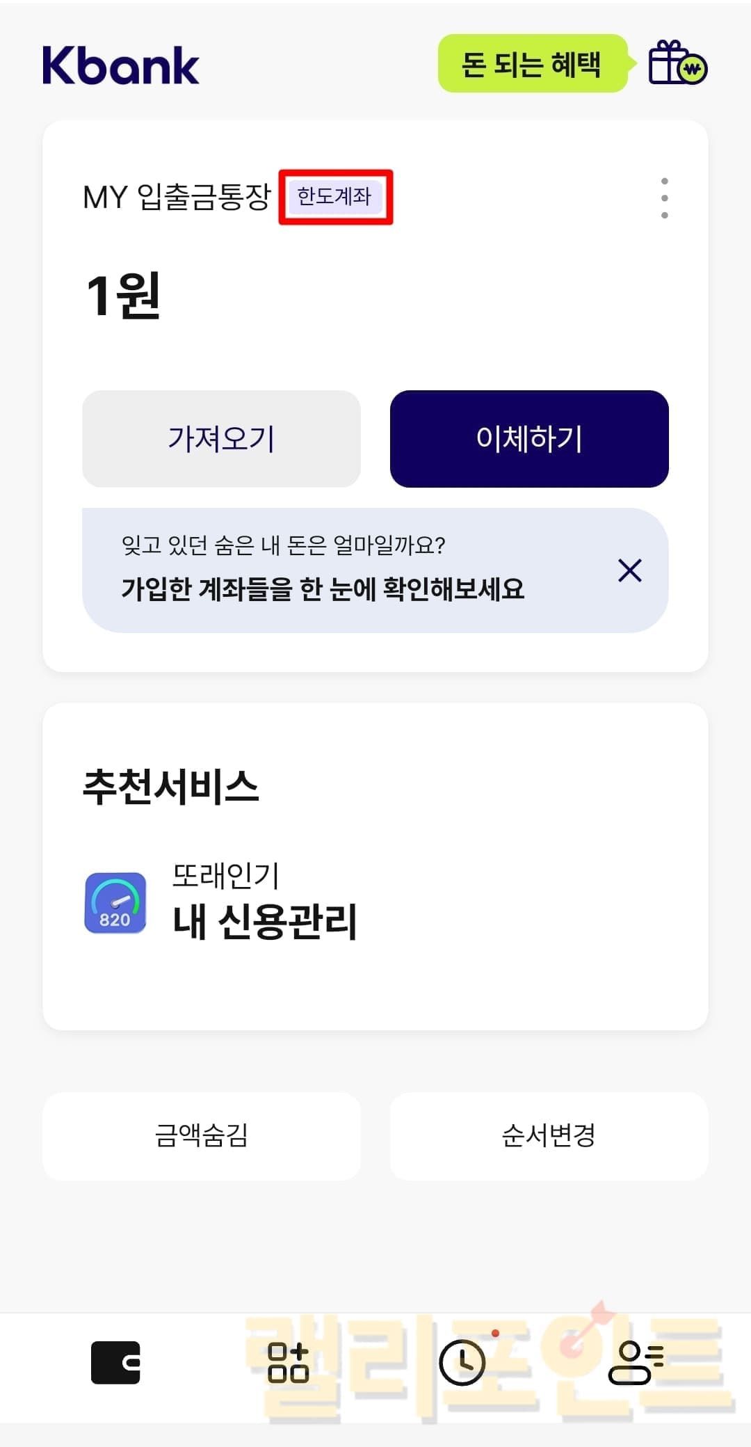 - 나의 통장에 있는 한도계좌 표시를 확인합니다.