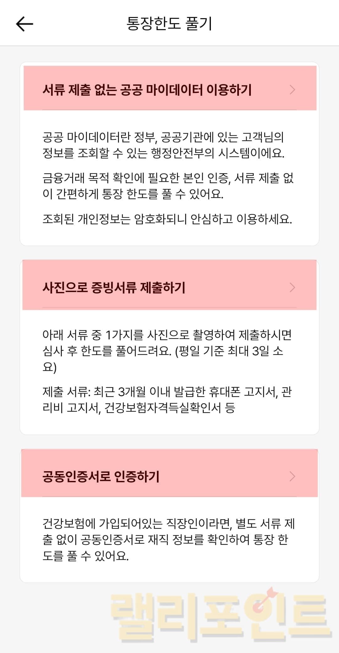 - 통장한도 풀기 3가지 방법 중 편리한 방법을 선택합니다.