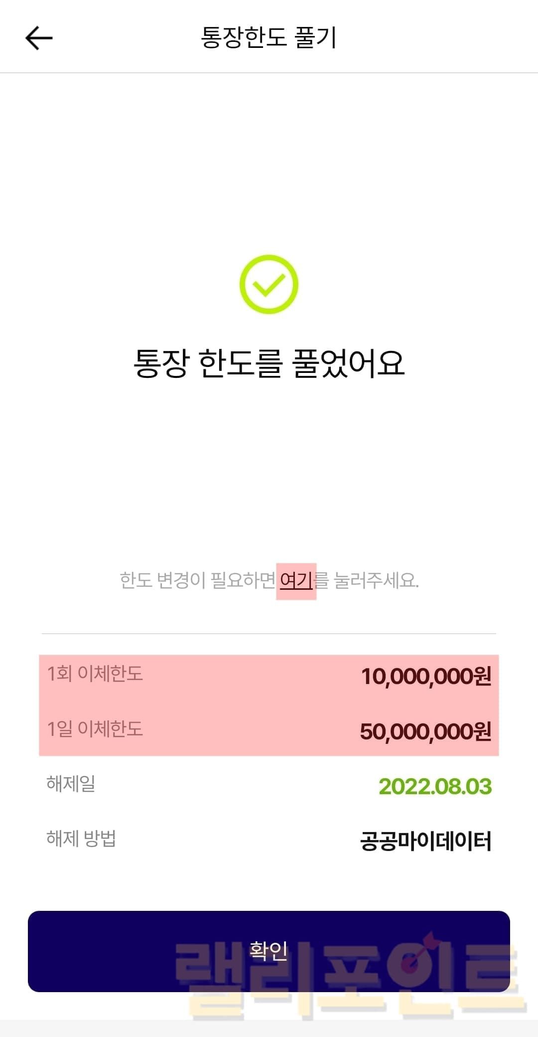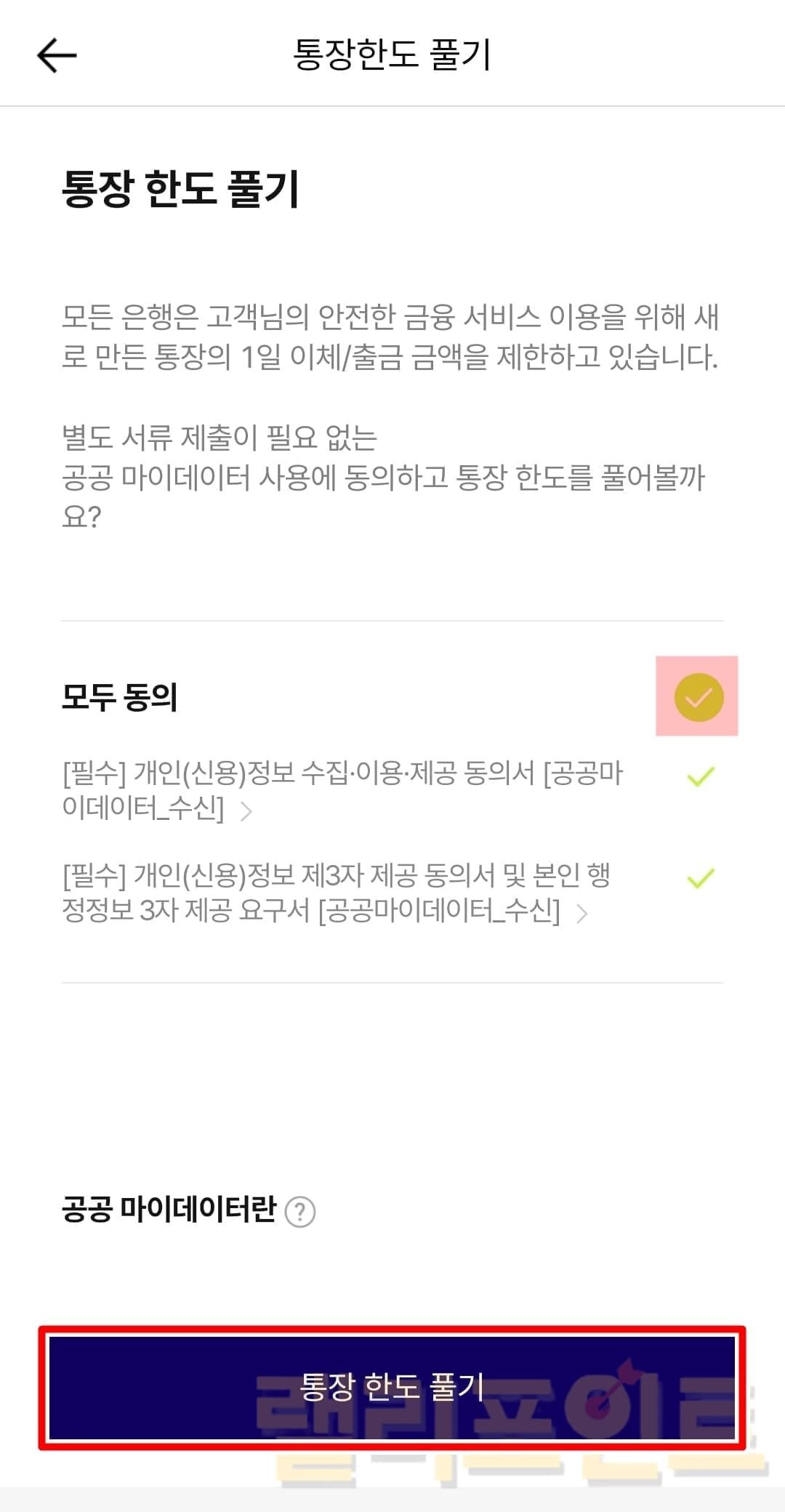 - 필수동의에 체크한 후 통장 한도 풀기를 클릭합니다.