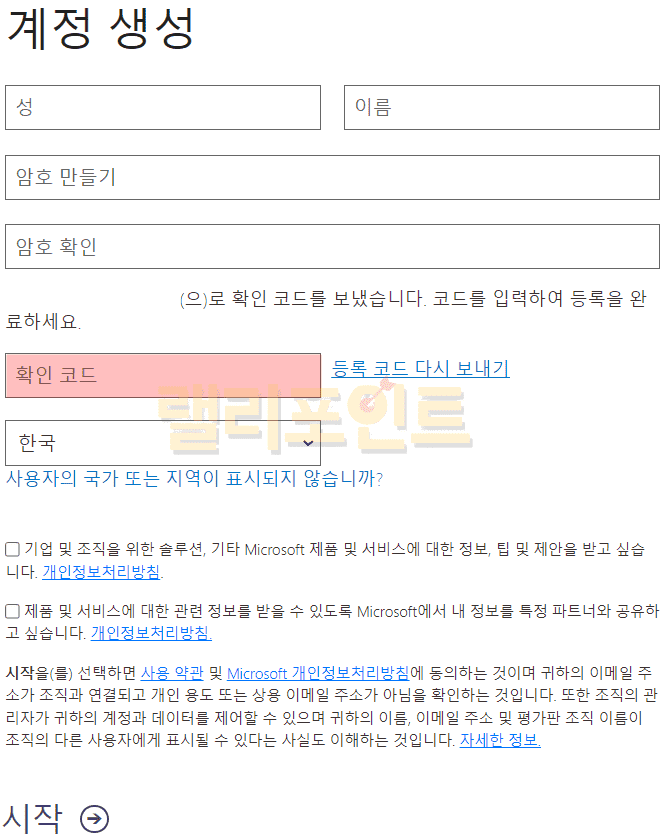 성, 이름, 암호를 입력하고 메일 인증, 국가는 한국 설정, 하단 약관에 모두 체크 후 시작을 누르면 완료입니다.