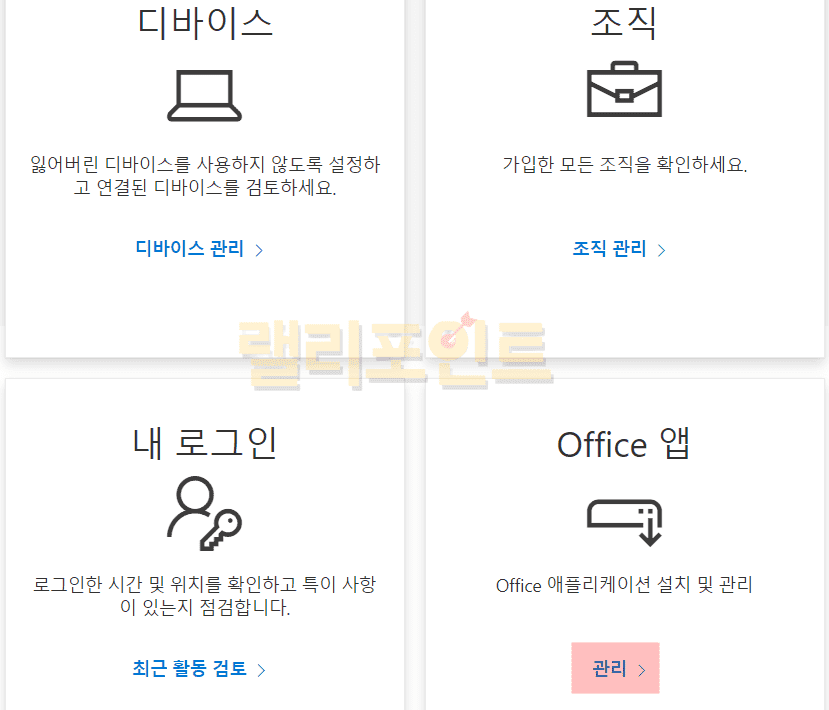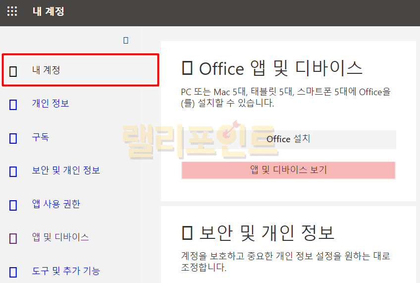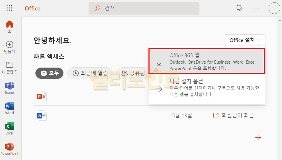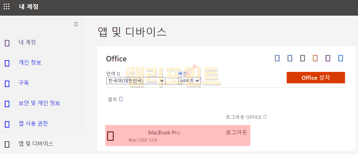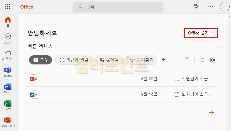 - 사이트 화면에서 Office 설치를 클릭합니다.